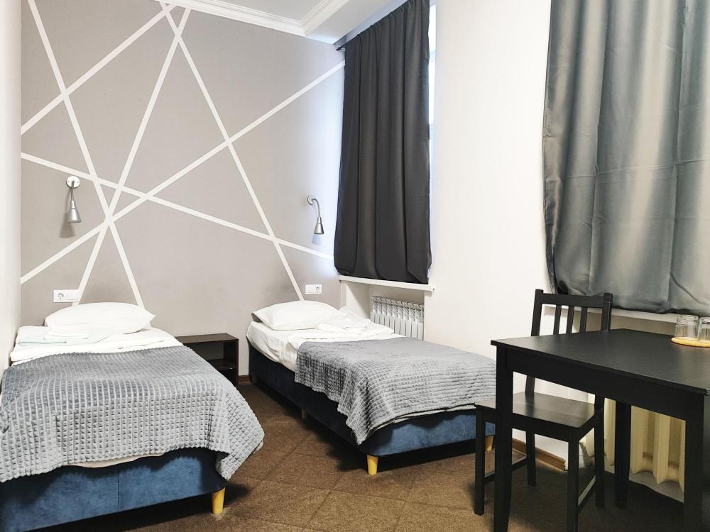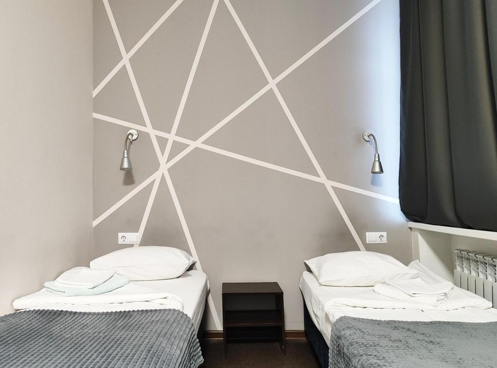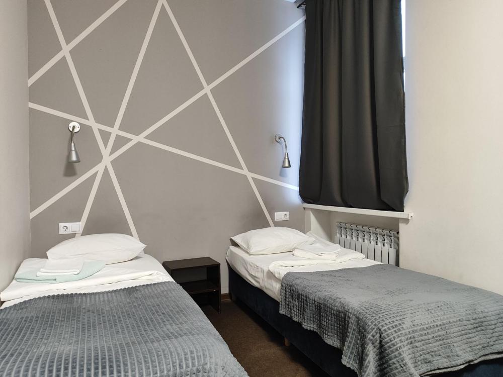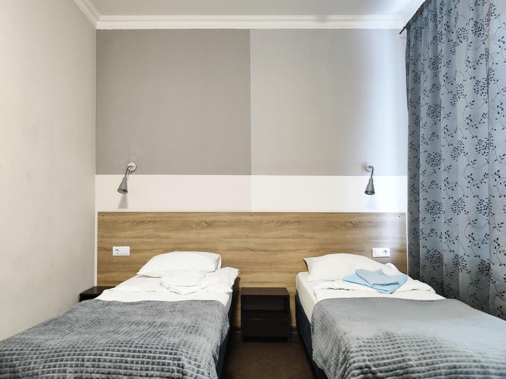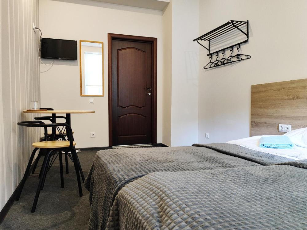Уютная, светлая комната 10 -14 кв.м. Идеальное размещение, как для пар, так и для друзей. В номере стол, стулья, две раздельные кровати с прикроватными тумбочками. Номера класса Эконом расположены на 1 этаже отеля. Души и туалеты для данной категории номеров расположены на этаже. Оснащение номера: • WiFi • Телевизор • Туалетные принадлежности • Фен (по запросу)