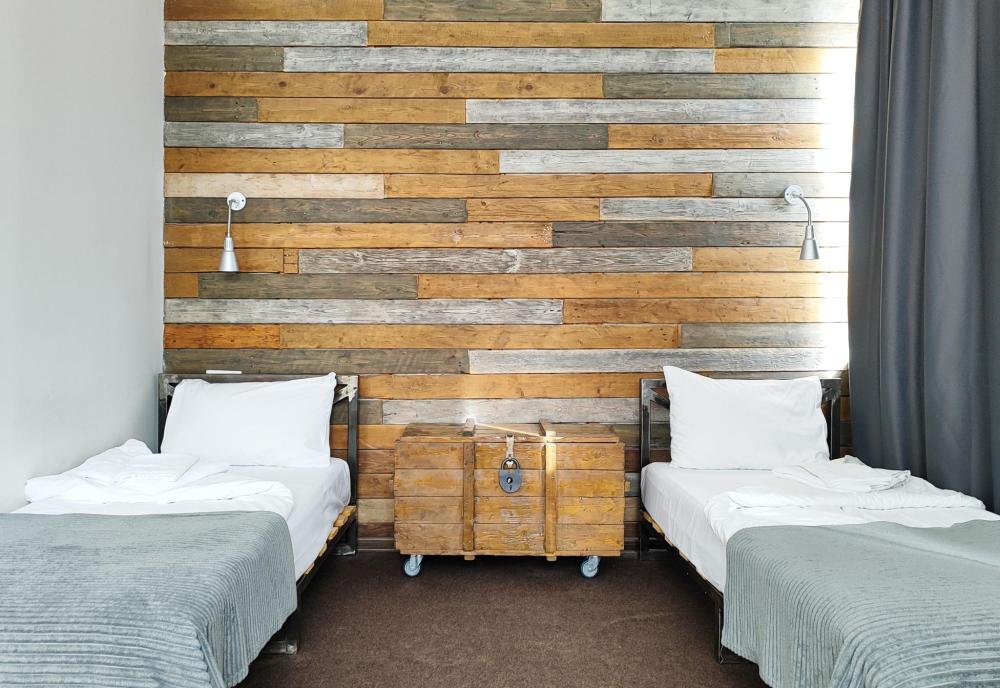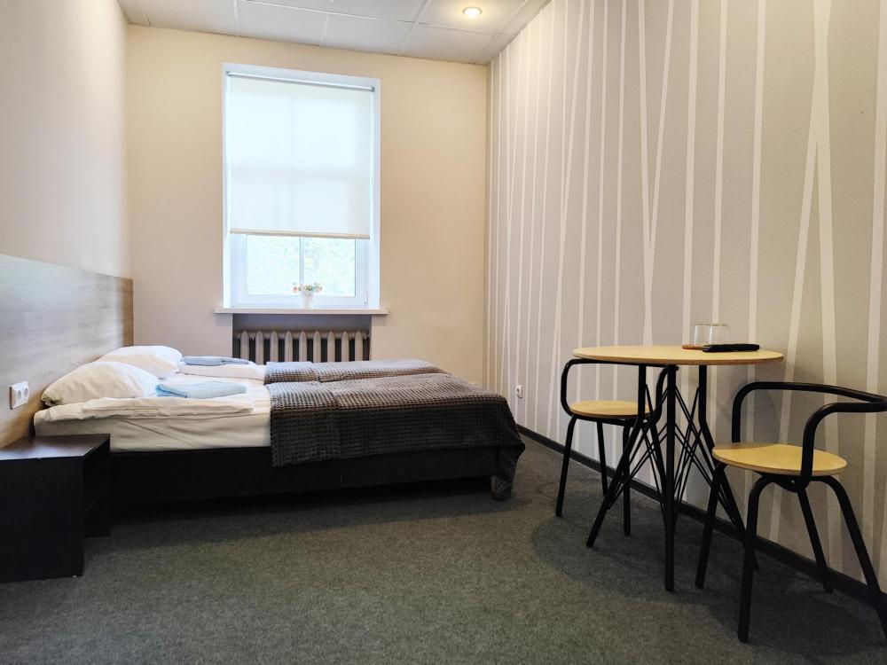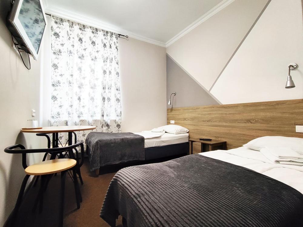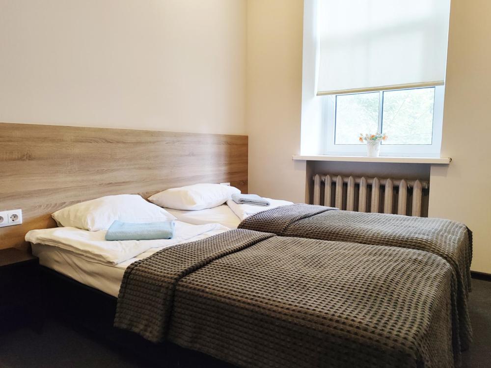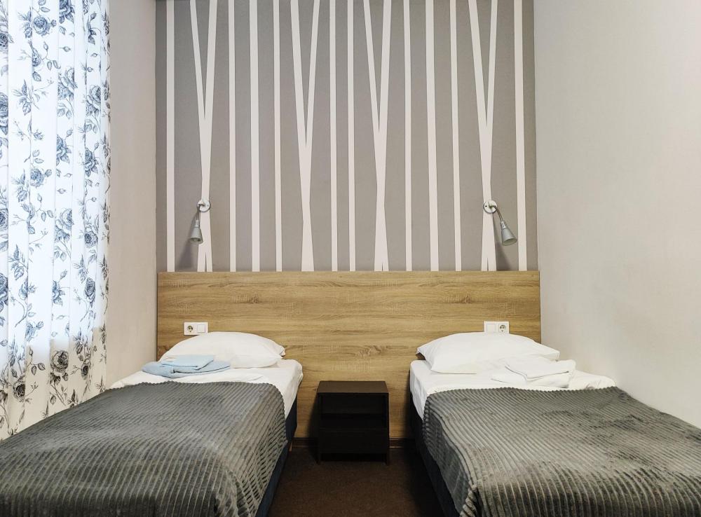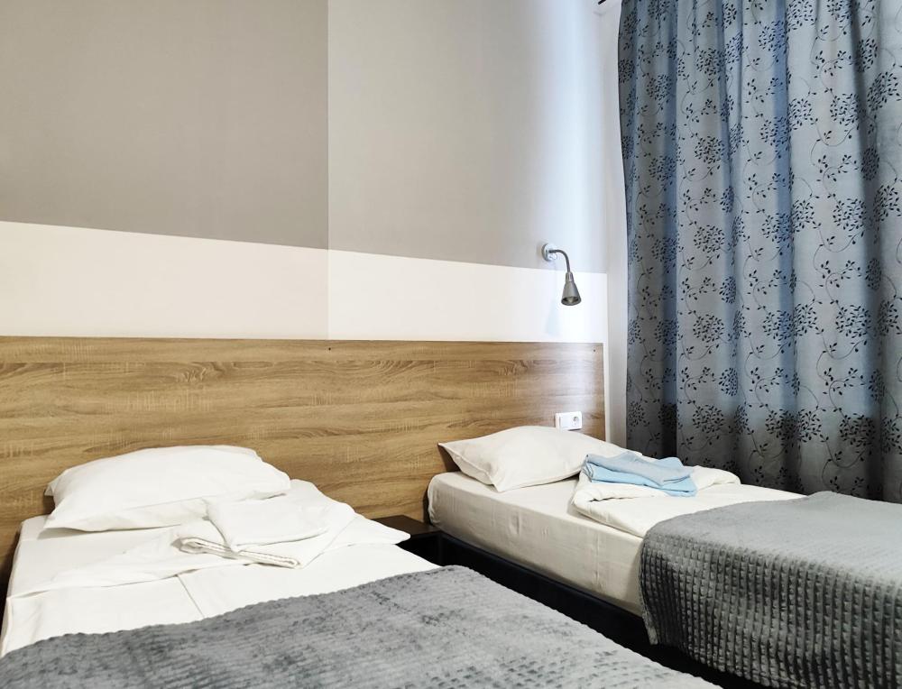 Уютная, светлая комната 10 -14 кв.м. Идеальное размещение, как для пар, так и для друзей. В номере стол, стулья, две раздельные кровати с прикроватными тумбочками. Номера класса Эконом расположены на 1 этаже отеля. Души и туалеты для данной категории номеров расположены на этаже. Оснащение номера: • WiFi • Телевизор • Туалетные принадлежности • Фен (по запросу)