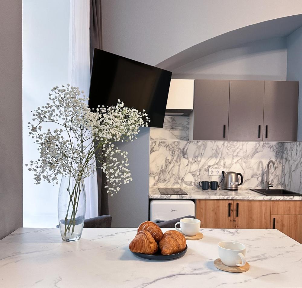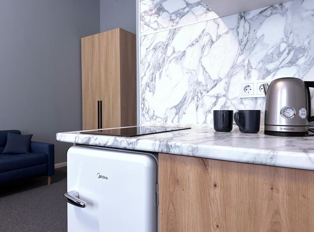 В комнате: двуспальная кровать и диван-кровать, шкаф, телевизор, кухонная зона. Вид на Невский проспект.