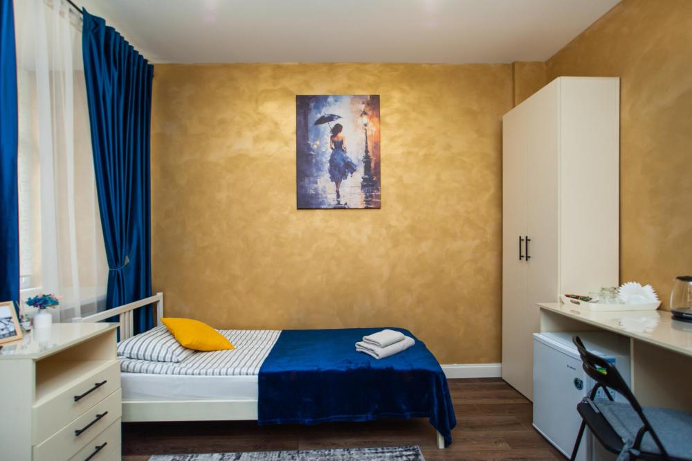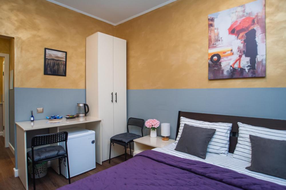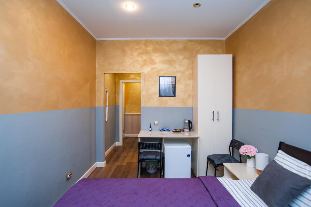 Номер общей площадью 13 м2 с двуспальной кроватью. Окно выходит в тихий двор. Оснащение: прикроватная тумба, телевизор (кабельное ТВ), холодильник, чайный набор, место для хранения вещей. Предоставляется комплект постельного белья, комплект полотенец на каждого гостя, косметические принадлежности, тапочки. В общей зоне: кулер с водой, микроволновая печь, стиральная машина, посудный шкаф, утюг и гладильная доска. Собственная ванная комната в номере. В ванной комнате есть фен. На всей территории отеля работает бесплатный Wi-Fi.
