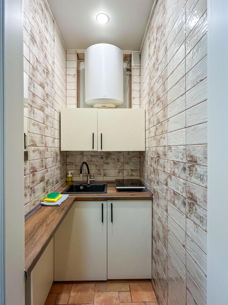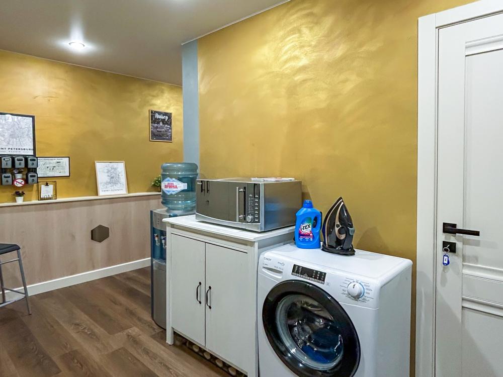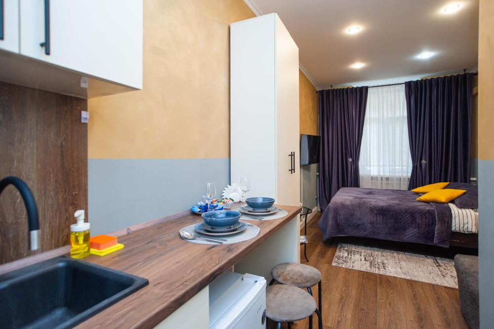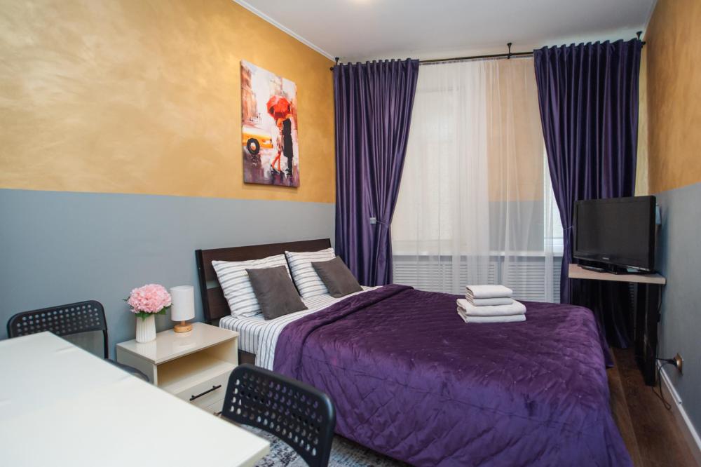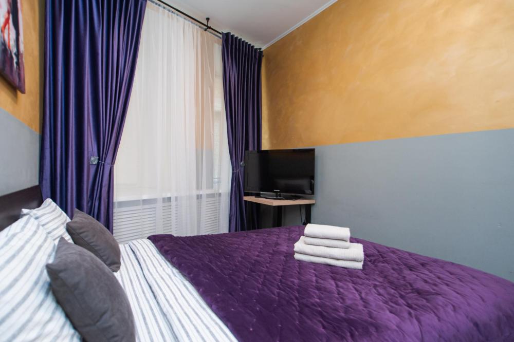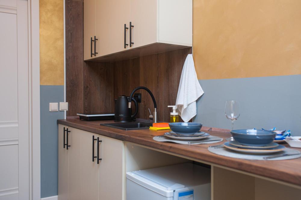 Номер общей площадью 16 м2 с кухней и двуспальной кроватью. Окна выходят в тихий двор. Оснащение: прикроватный столик, телевизор (кабельное ТВ), холодильник, чайный набор, шкаф для одежды. Собственный туалет и душ в номере. В ванной комнате есть фен. Предоставляется комплект постельного белья, комплект полотенец на каждого гостя, косметические принадлежности, тапочки. В общей зоне: кулер с водой, микроволновая печь, стиральная машина, посудный шкаф, утюг и гладильная доска. На всей территории отеля работает бесплатный Wi-Fi.