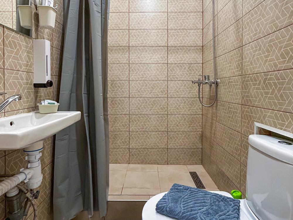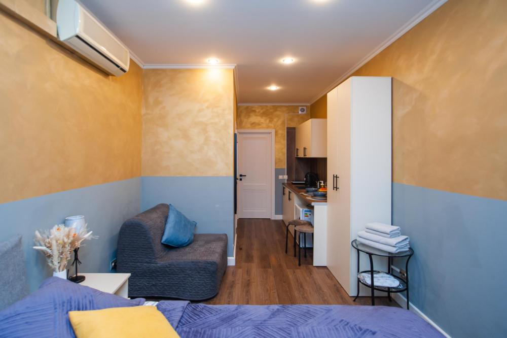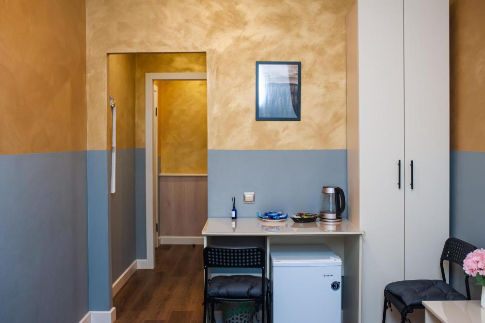 Номер общей площадью 18 м2 с двуспальной кроватью и дополнительным спальным местом. В номере есть кухня. Окно выходит в тихий двор. Оснащение: кондиционер, прикроватный столик, стол, стулья, холодильник, телевизор (кабельное ТВ), чайный набор, шкаф для хранения вещей, раскладное кресло. Предоставляется комплект постельного белья, комплект полотенец на каждого гостя, косметические принадлежности, тапочки. В общей зоне: кулер с водой, микроволновая печь, стиральная машина, посудный шкаф, утюг и гладильная доска. Собственная ванная комната в номере. В ванной комнате есть фен. На всей территории отеля работает бесплатный Wi-Fi.