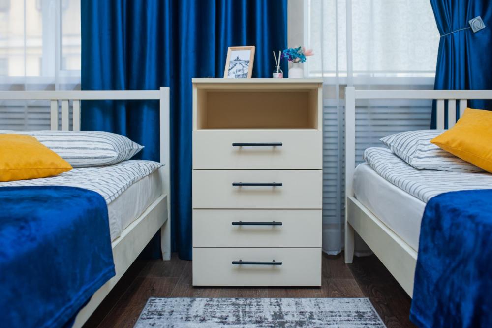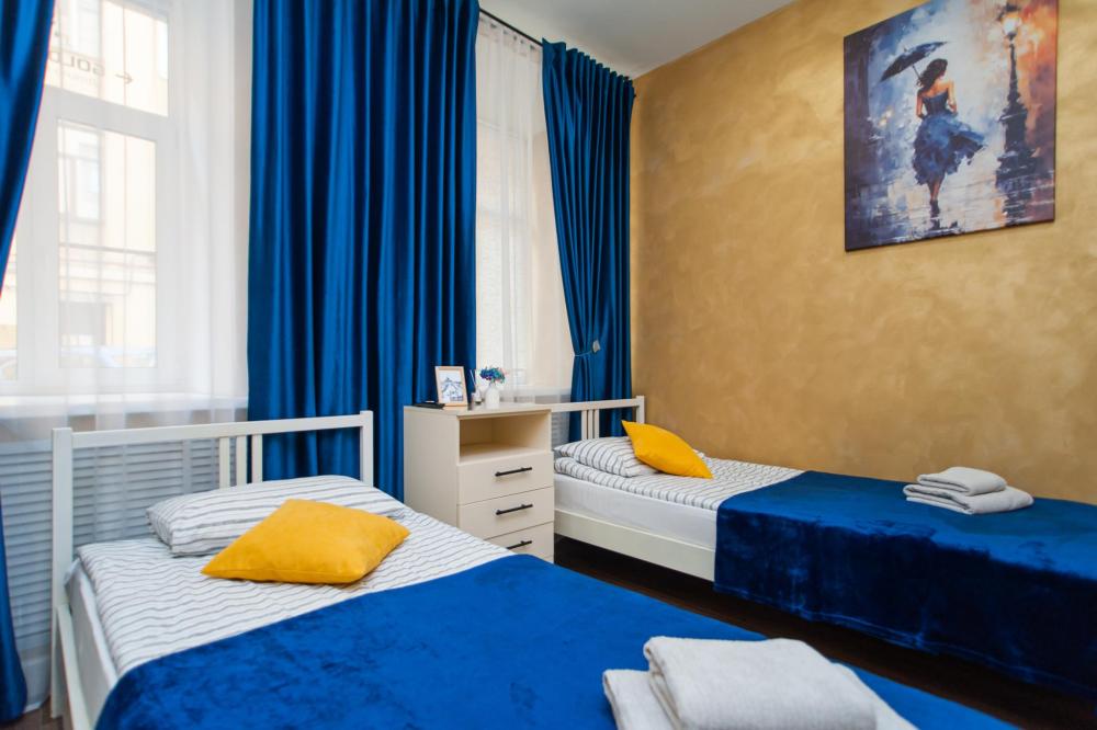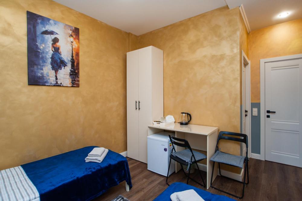 Номер общей площадью 16 м2 с раздельными односпальными кроватями. В номере два окна, которые выходят в тихий двор. Оснащение: телевизор (кабельное ТВ), стол, стулья, чайный набор, холодильник, шкаф для одежды. Предоставляется комплект постельного белья, и комплект полотенец на каждого гостя, косметические принадлежности, тапочки. В общей зоне: кулер с водой, микроволновая печь, стиральная машина, посудный шкаф, утюг и гладильная доска. В ванной комнате есть фен. На всей территории отеля работает бесплатный Wi-Fi.