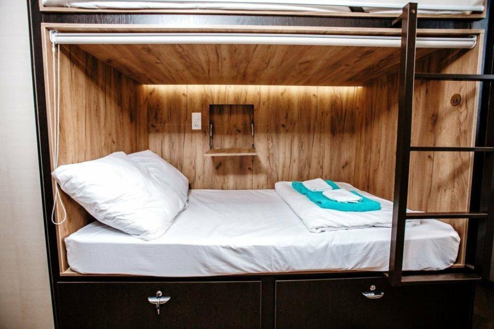 Одноместная капсула в четырехместном женском номере (нижний, верхний ярусы). Для Вас комфортный ортопедический матрас (90*200 спальное место). Комплект постельного белья из сатина, махровые полотенца. Окно на тихую улицу для комфортного сна.