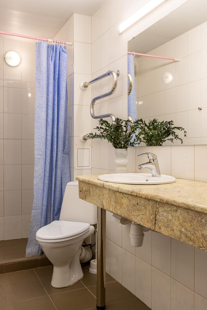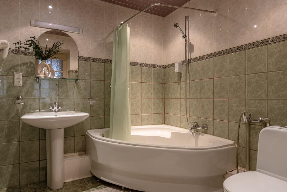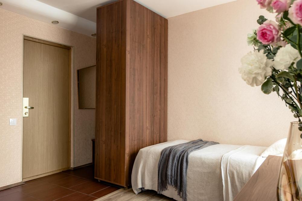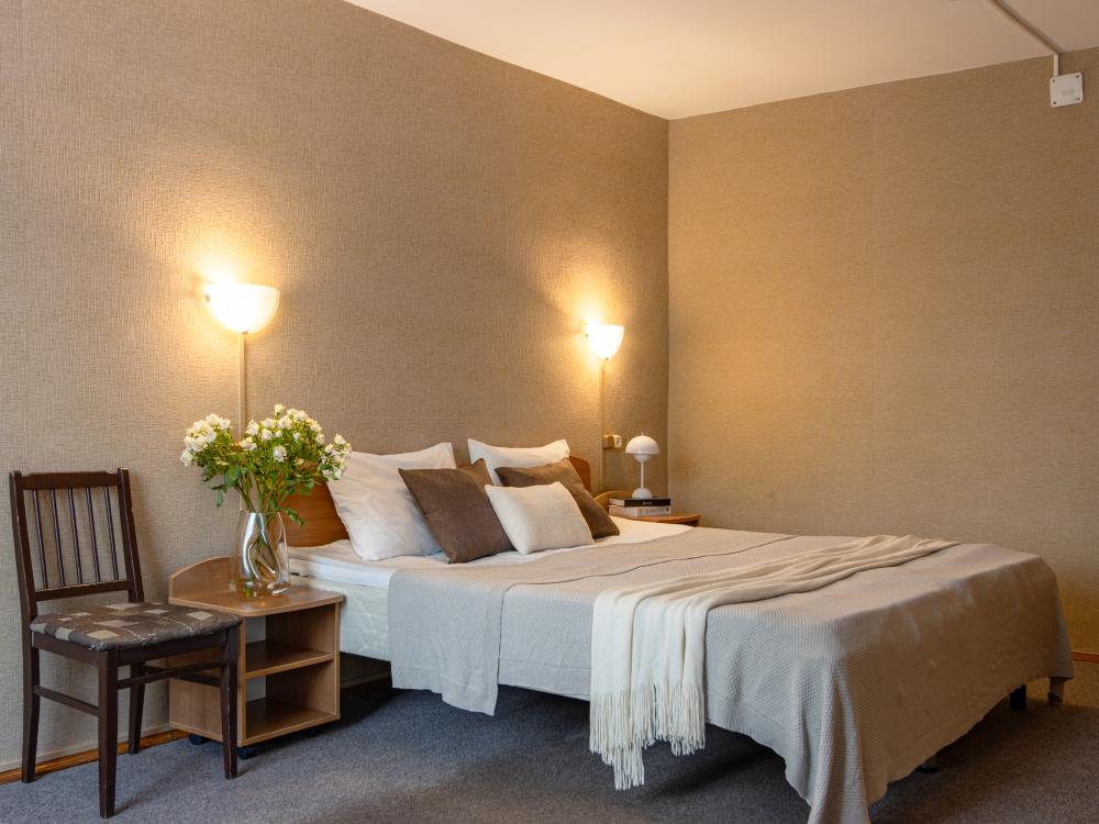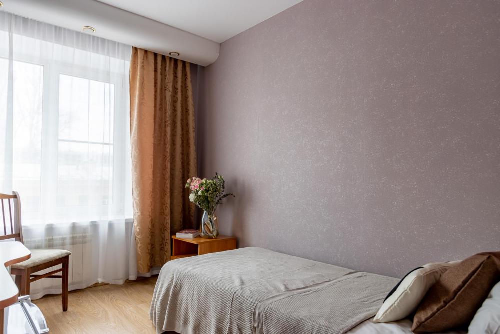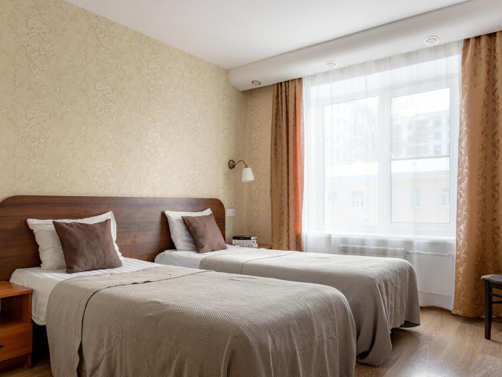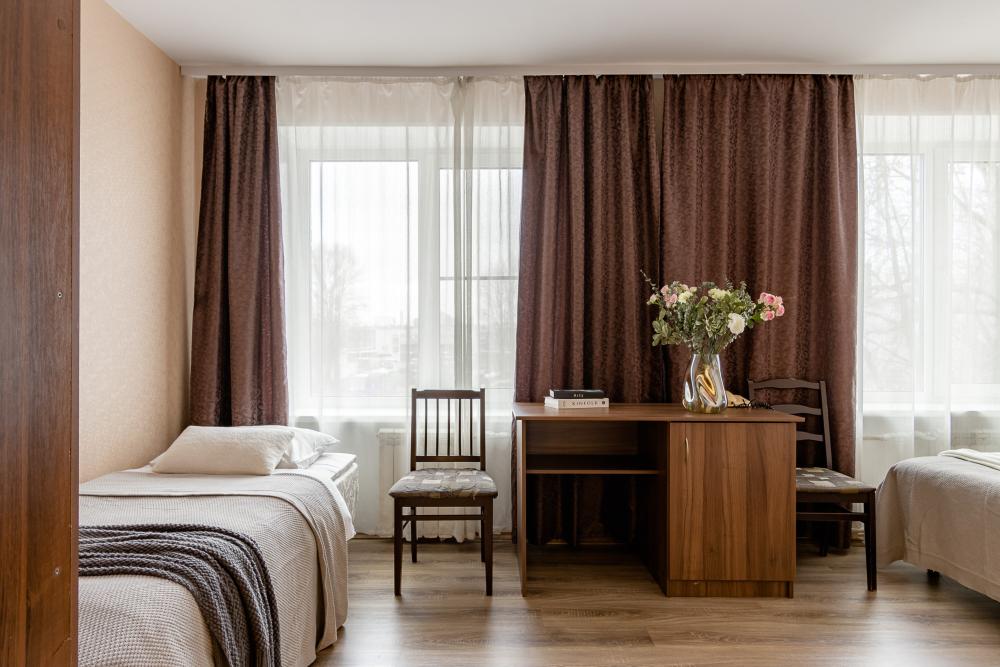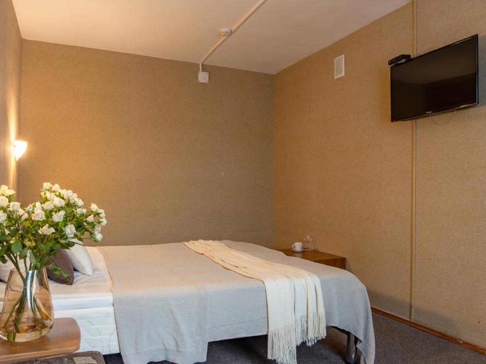 В номере: душ, туалет, телефон, телевизор, две кровати с прикроватными тумбочками, рабочий стол, стул, зеркало, удобный финский шкаф, полотенца для Вашего комфорта. Холодильник, микроволновая печь есть у дежурной горничной. На этаже находится гладильная комната.