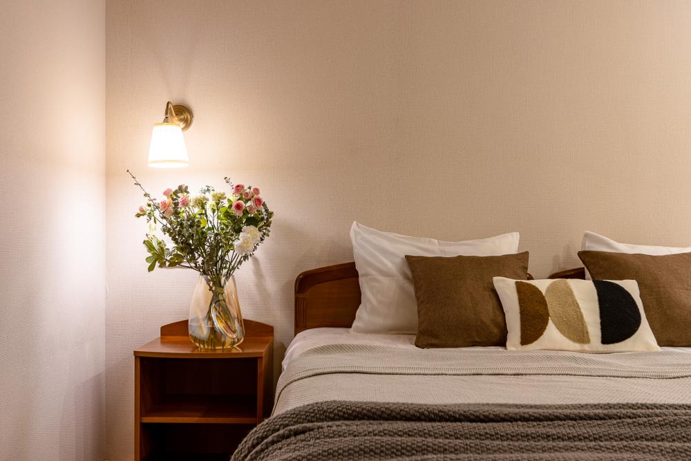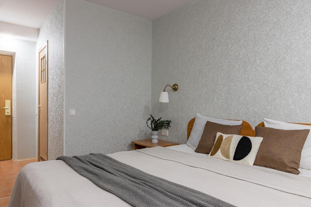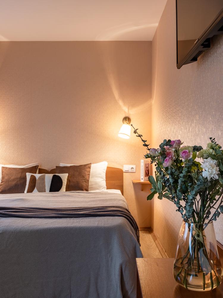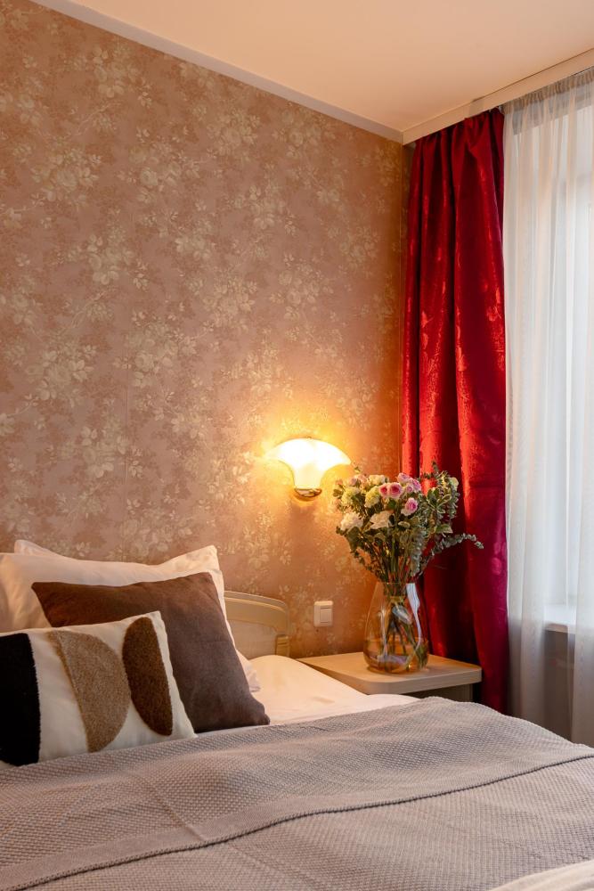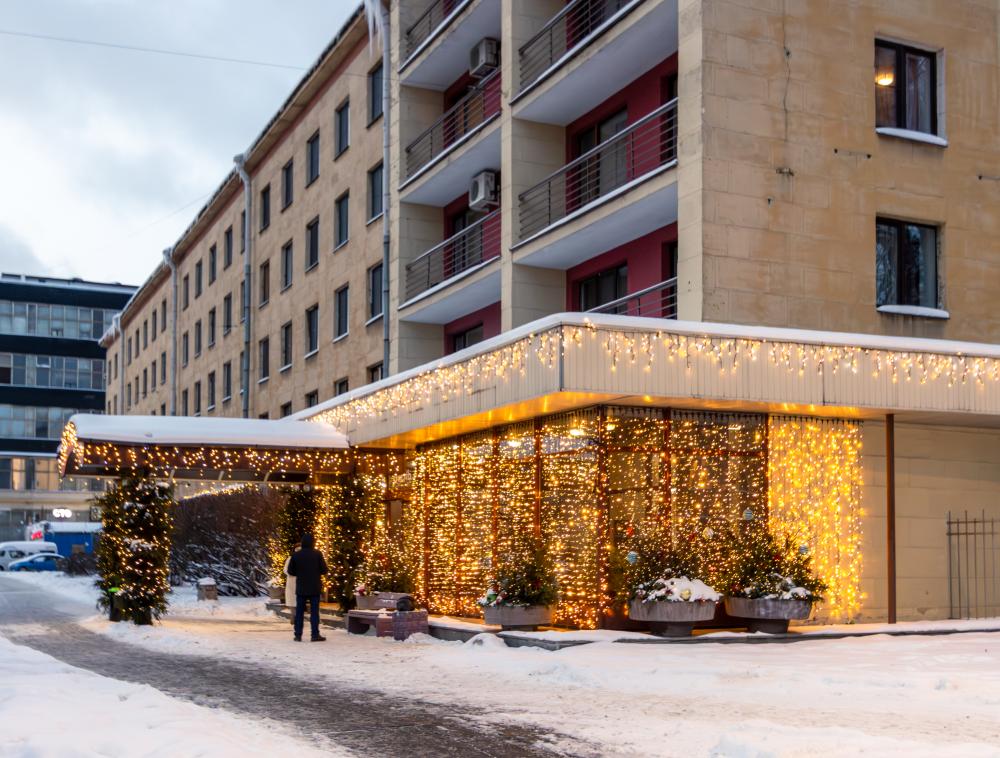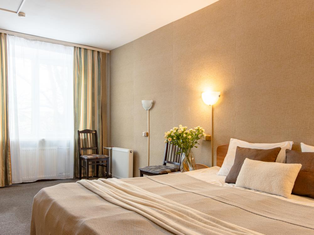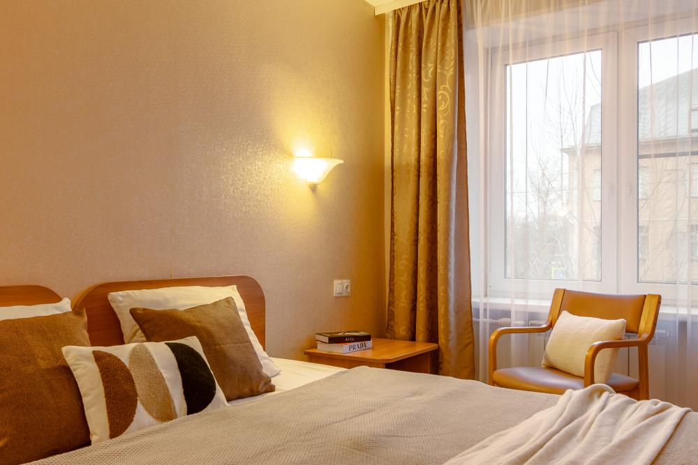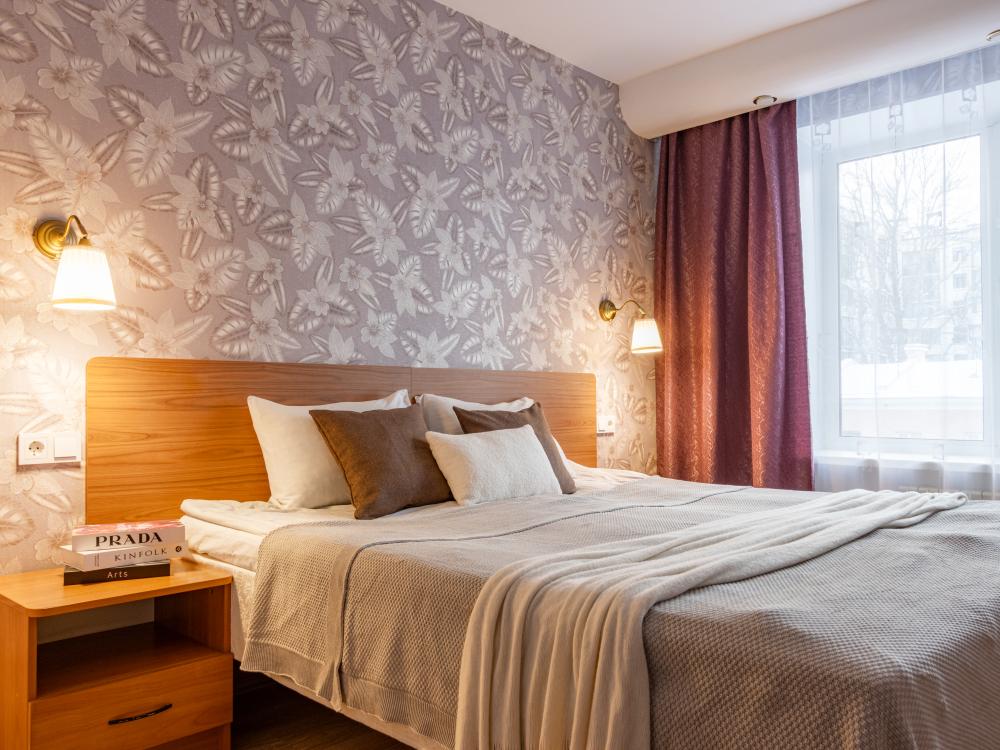 В номере: душ, туалет, телефон, телевизор, две кровати с прикроватными тумбочками, рабочий стол, стул, зеркало, удобный финский шкаф, полотенца для Вашего комфорта. Холодильник, микроволновая печь есть у дежурной горничной. На этаже находится гладильная комната.