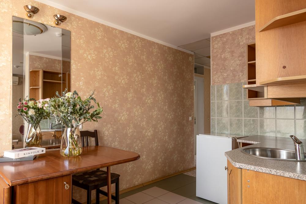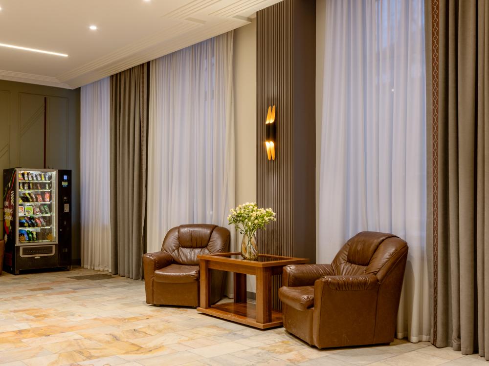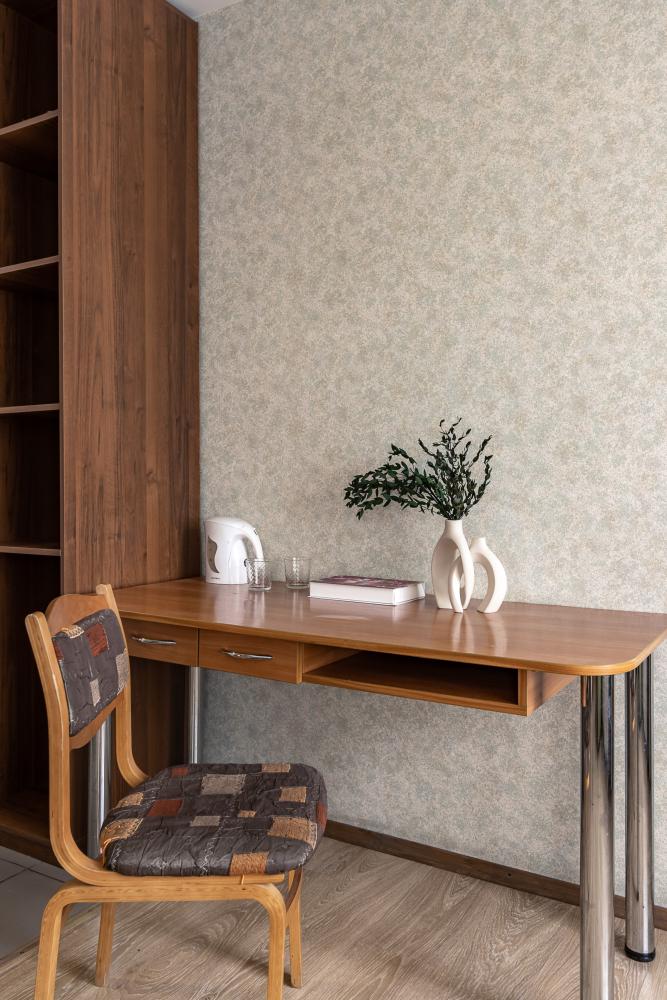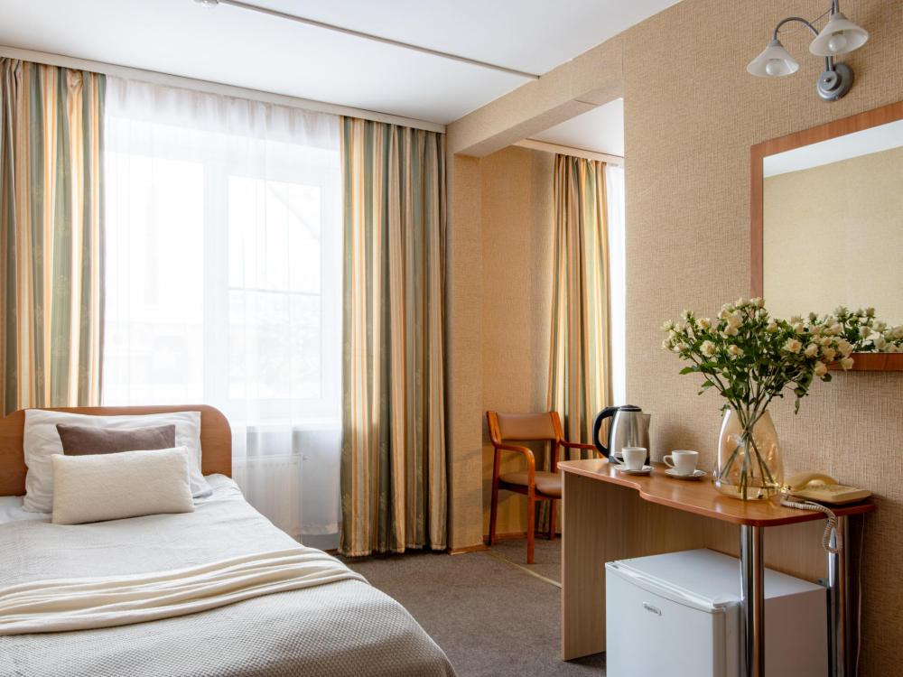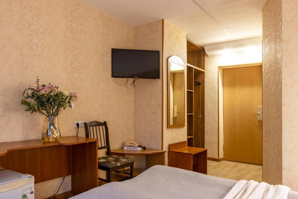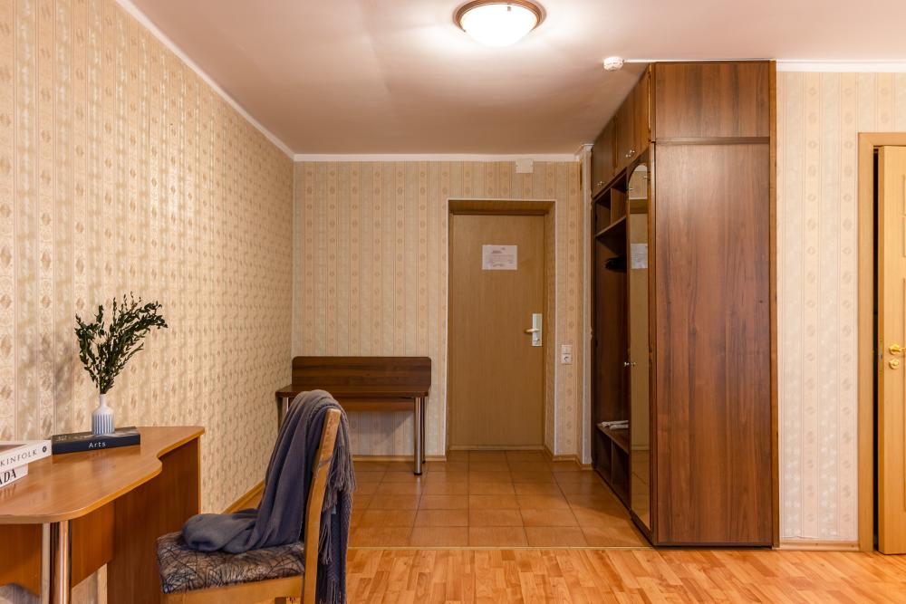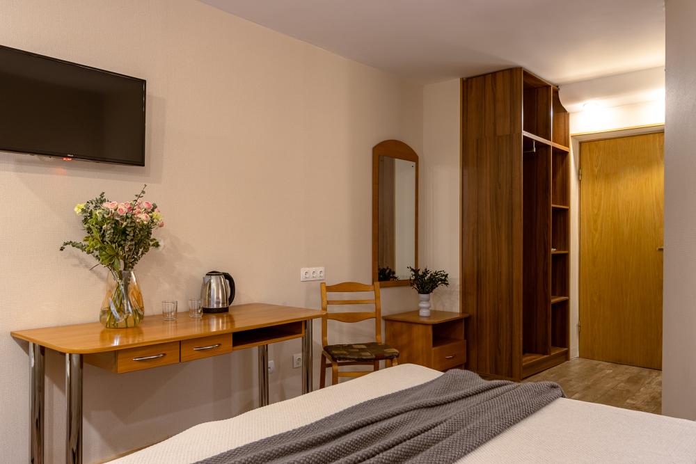 Номер со всеми удобствами- душ, туалет, телефон, телевизор, комфортная кровать с прикроватной тумбочкой, рабочий стол, стул, встроенный шкаф, зеркало, полотенца для Вашего удобства. Холодильник, микроволновая печь есть у дежурной горничной. На этаже находится гладильная комната.