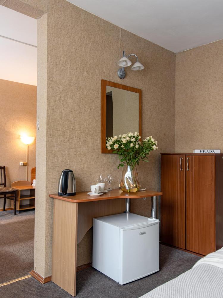 Во всех номерах есть электрочайник, столовый и чайный сервизы, холодильник, вентилятор. В холодное время года можно воспользоваться обогревателем. Мы также позаботились о том, чтобы Вы брали меньше вещей с собой в дорогу- в ванной комнате Вы всегда можете воспользоваться феном, а также утюгом и гладильной доской. Создать домашнюю атмосферу Вам помогут тапочки.