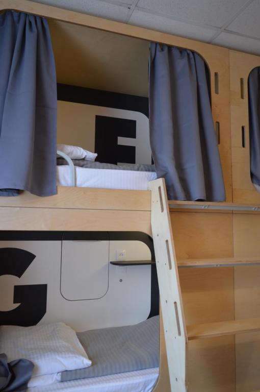 Общий номер повышенной комфортности: в каждом слипбоксе есть личный источник света, а чтобы он не мешал соседям - плотные темные шторки. Широкая лестница позволяет без труда подняться на верхний ярус. Для чемодана предусмотрен выкатной ящик под кроватью, а для ценных вещей - шкафчик на электронном замке. Каждое спальное место снабжено розетками и широким откидным столиком.