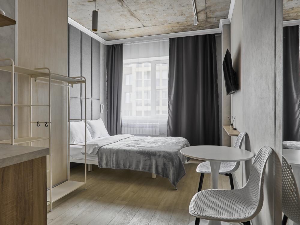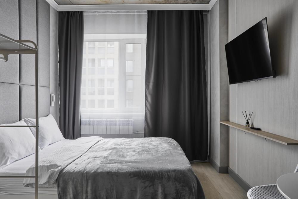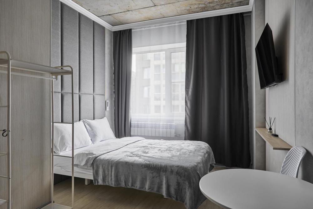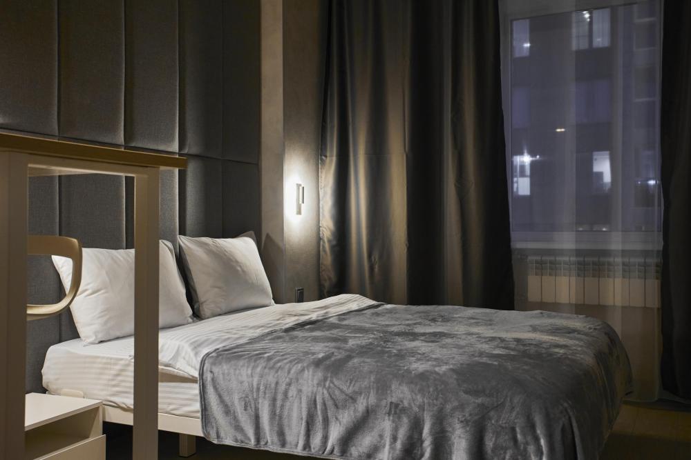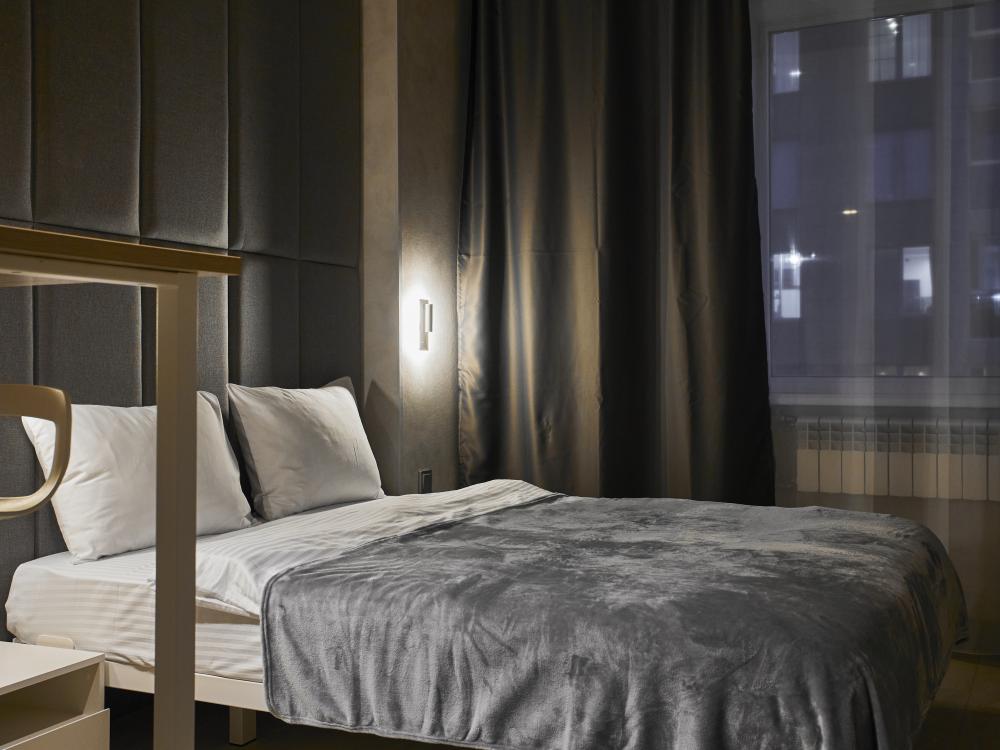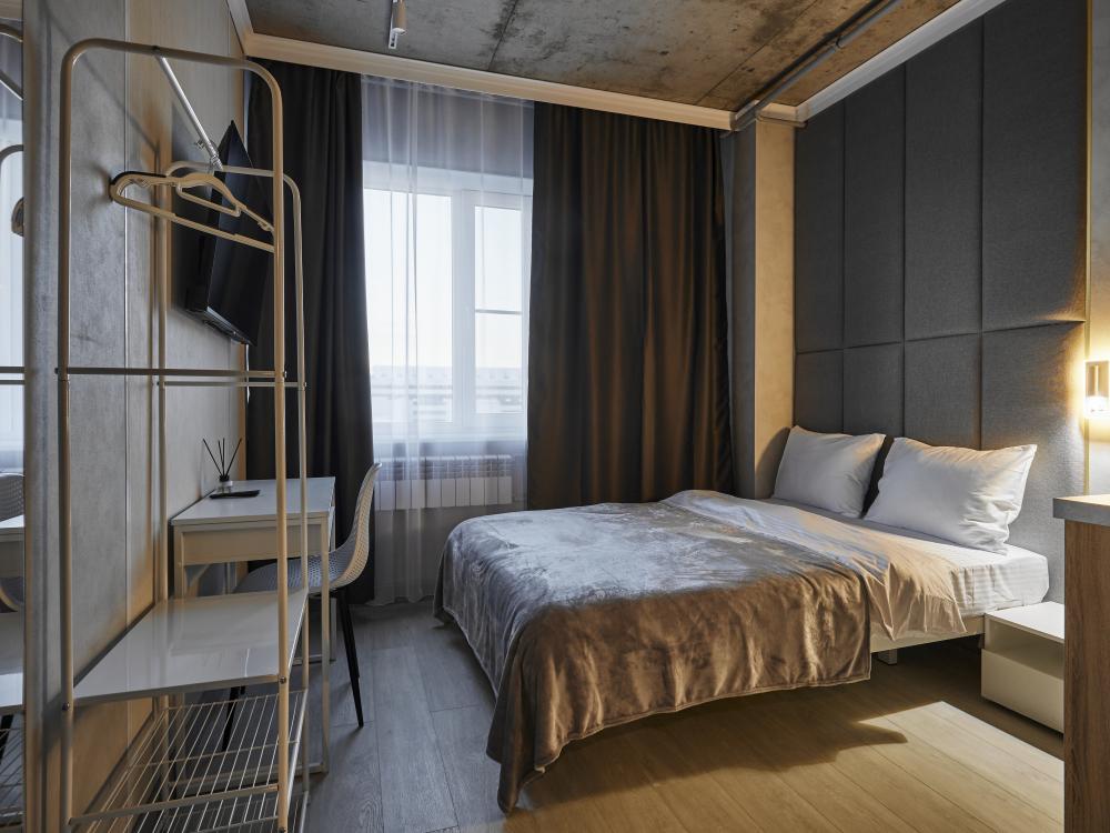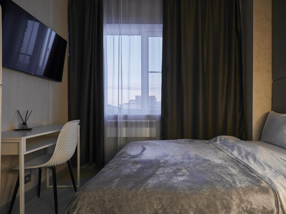 Улучшенный двухместный номер на 5 этаже. В номере — удобная двуспальная кровать и свежий ремонт. Особое удобство создаёт полноценный обеденный стол, где можно с комфортом принять пищу или поработать. Для комфортного проживания предусмотрены кондиционер и телевизор. Гости могут пользоваться посудой, микроволновой печью и чайником. В совмещённом санузле есть душ, фен, постельное бельё, полотенца и душевые наборы. На этаже расположена общая зона с гладильной доской, утюгом и стиральной машиной. Уважаемые гости! С 22:00 до 08:00 вход в отель осуществляется по внешней лестнице