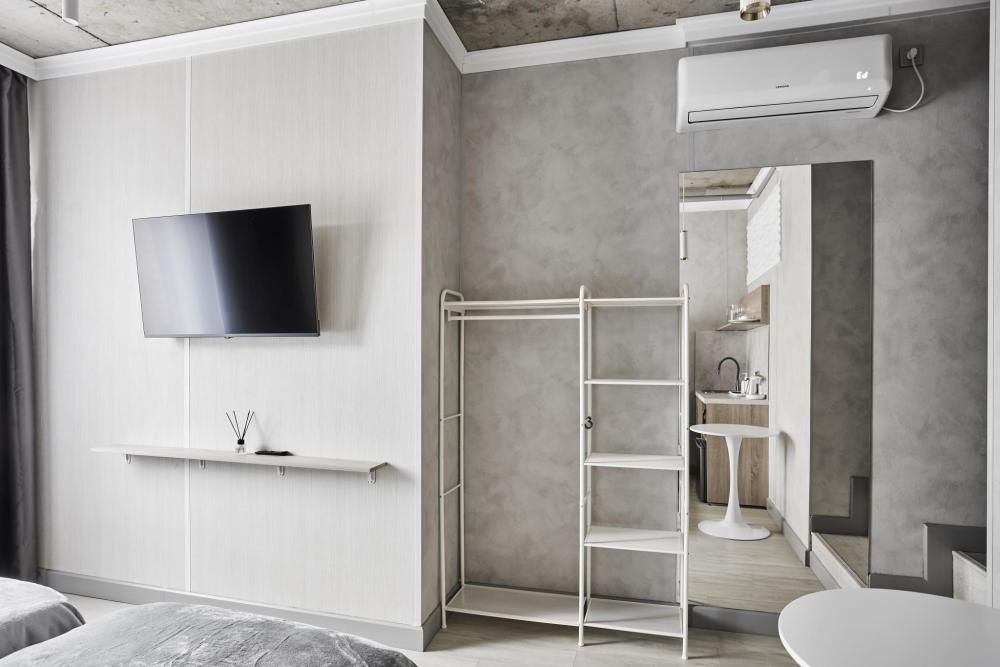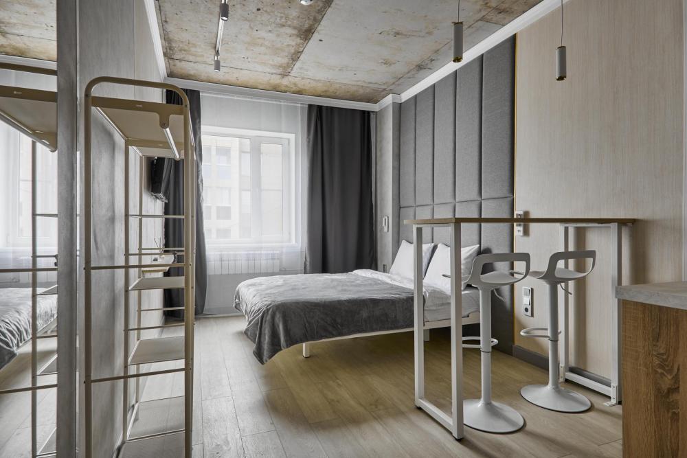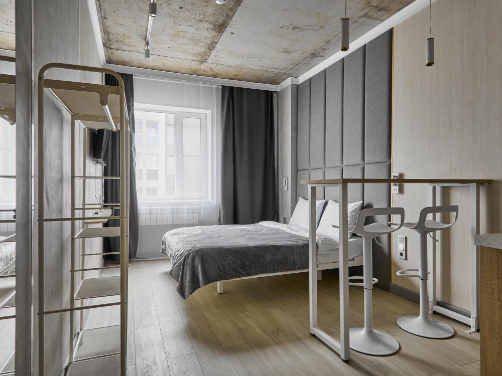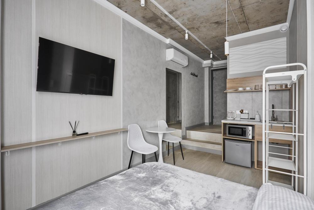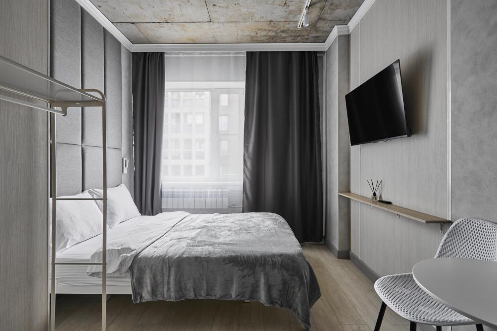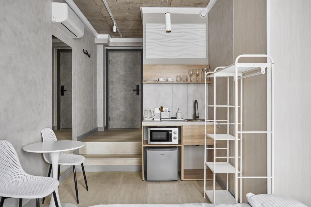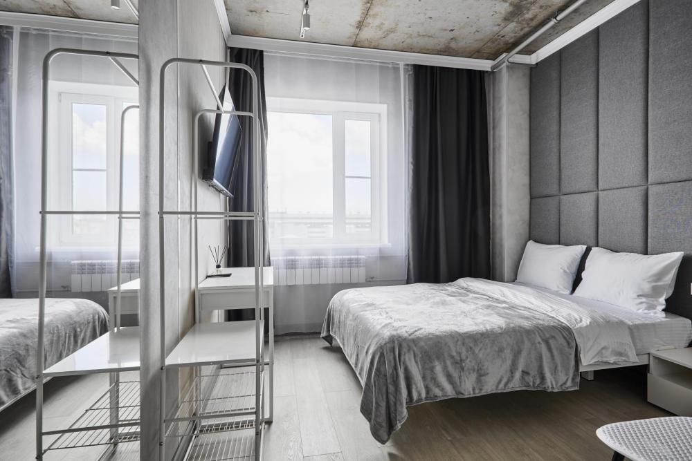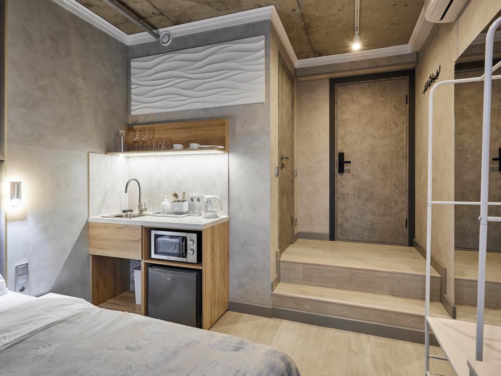 Улучшенный двухместный номер на 5 этаже. В номере — удобная двуспальная кровать и свежий ремонт. Особое удобство создаёт полноценный обеденный стол, где можно с комфортом принять пищу или поработать. Для комфортного проживания предусмотрены кондиционер и телевизор. Гости могут пользоваться посудой, микроволновой печью и чайником. В совмещённом санузле есть душ, фен, постельное бельё, полотенца и душевые наборы. На этаже расположена общая зона с гладильной доской, утюгом и стиральной машиной. Уважаемые гости! С 22:00 до 08:00 вход в отель осуществляется по внешней лестнице