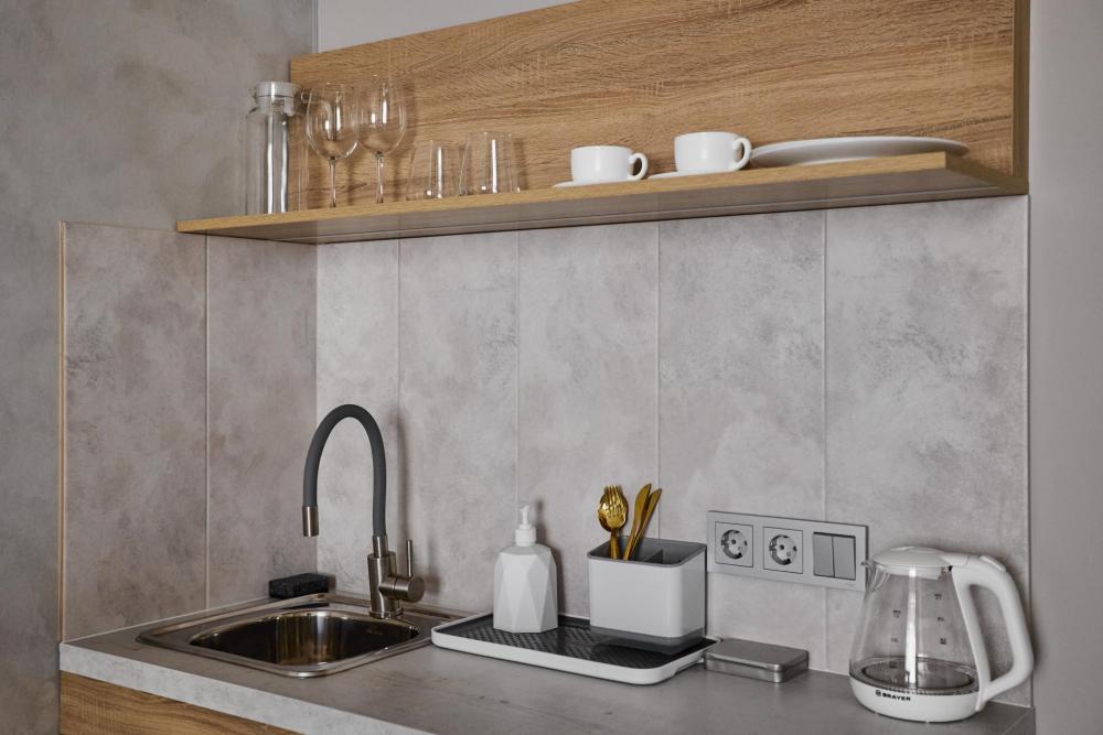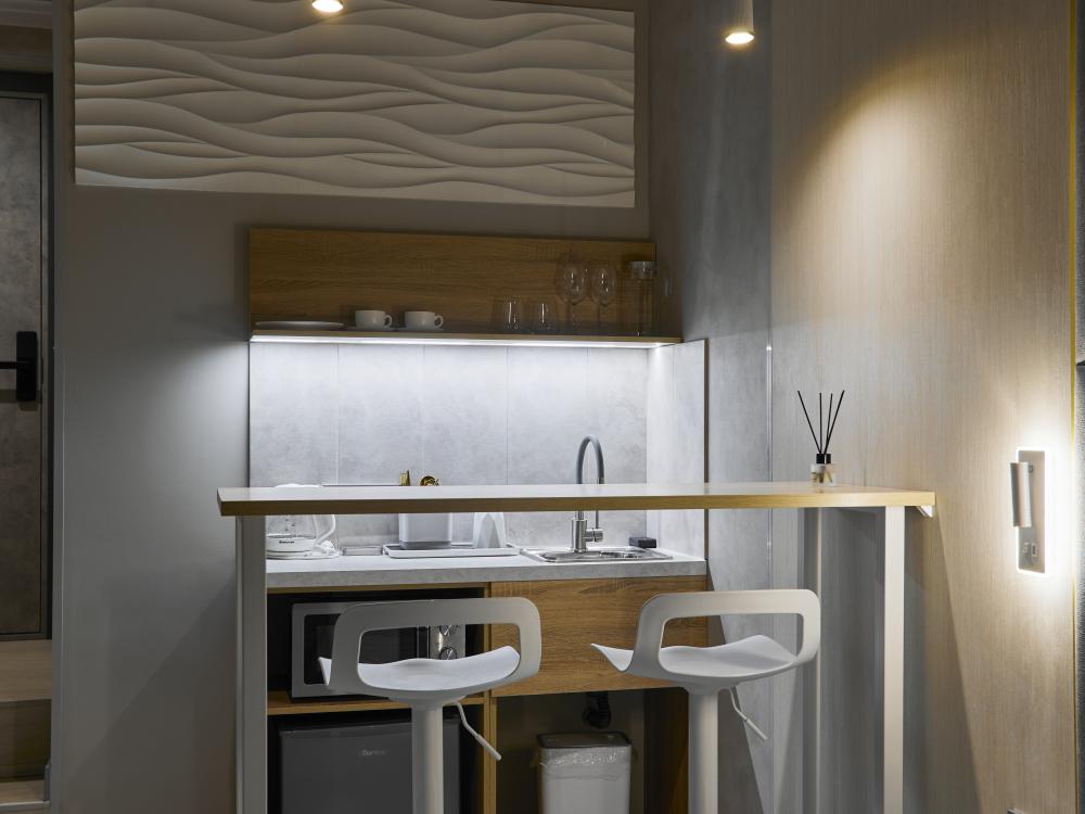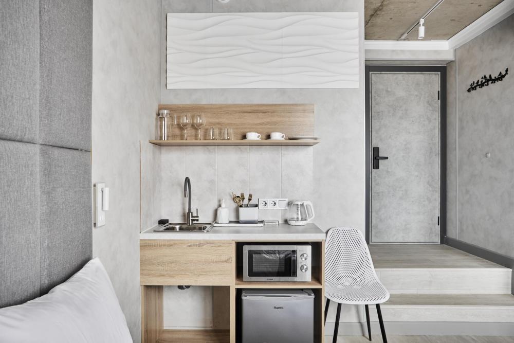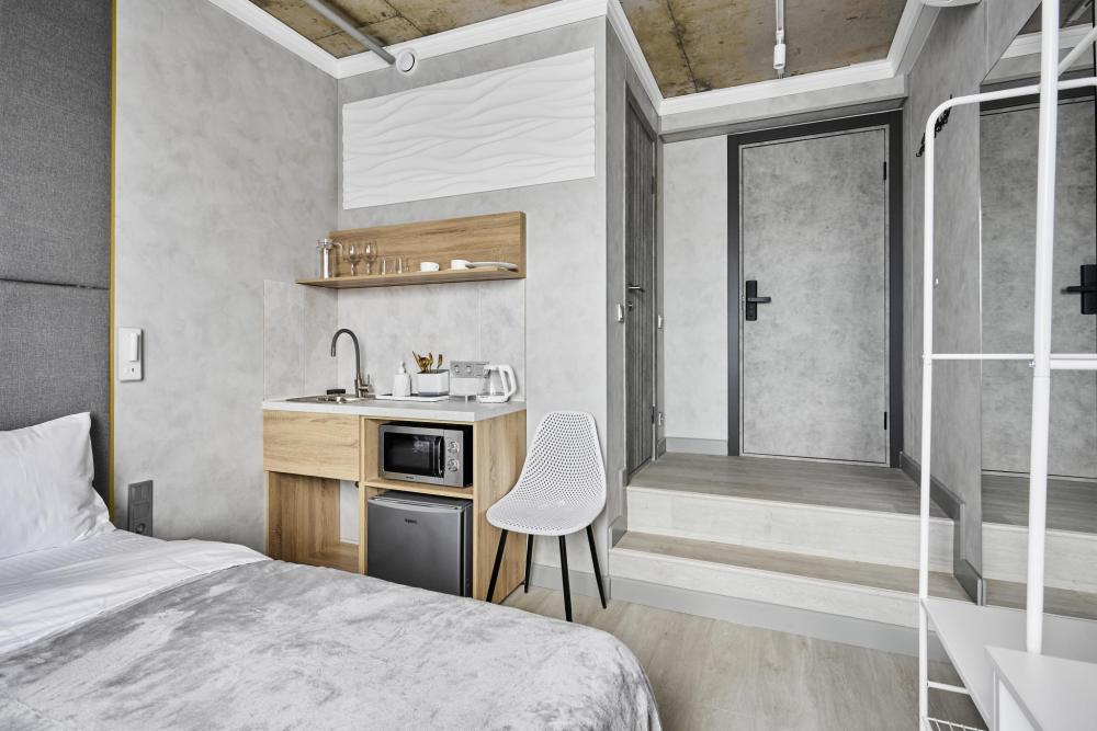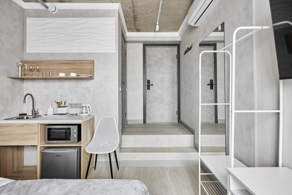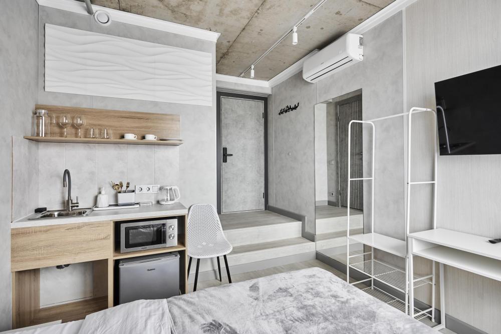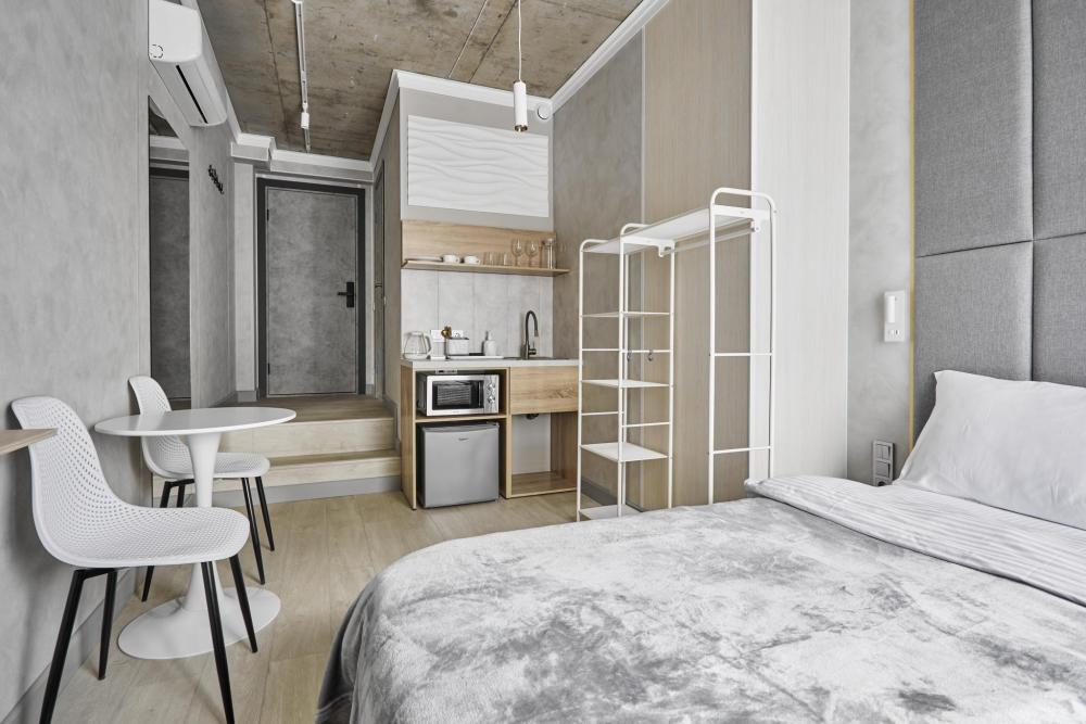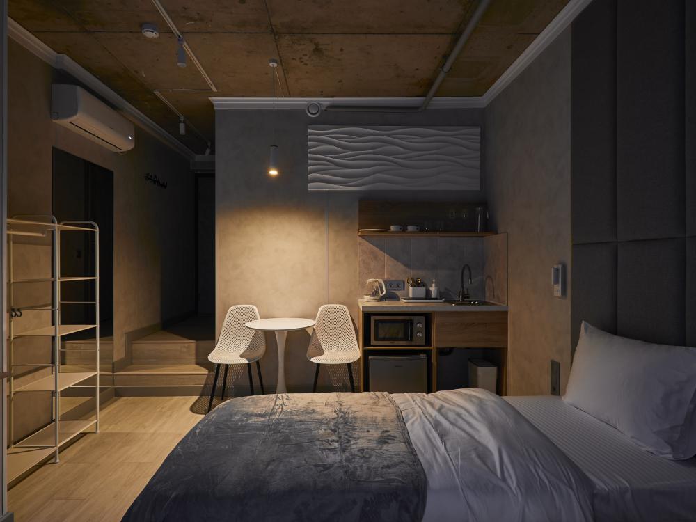 Улучшенный двухместный номер на 5 этаже. В номере — удобная двуспальная кровать и свежий ремонт. Особое удобство создаёт полноценный обеденный стол, где можно с комфортом принять пищу или поработать. Для комфортного проживания предусмотрены кондиционер и телевизор. Гости могут пользоваться посудой, микроволновой печью и чайником. В совмещённом санузле есть душ, фен, постельное бельё, полотенца и душевые наборы. На этаже расположена общая зона с гладильной доской, утюгом и стиральной машиной. Уважаемые гости! С 22:00 до 08:00 вход в отель осуществляется по внешней лестнице