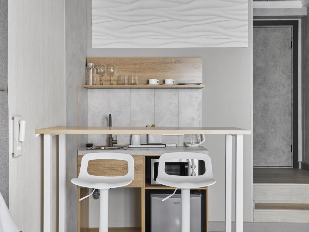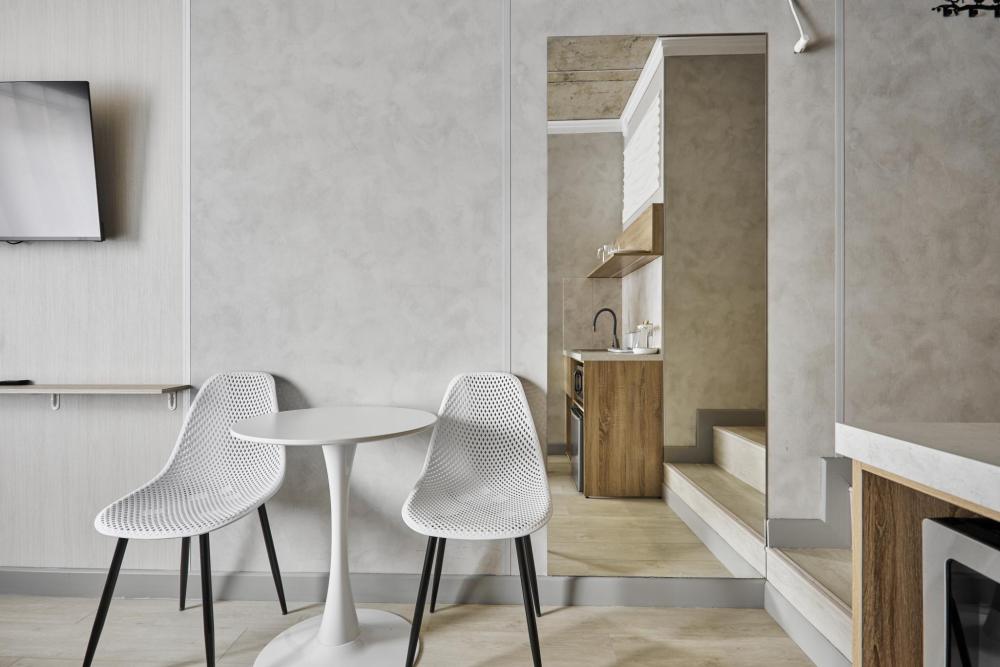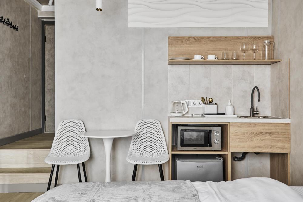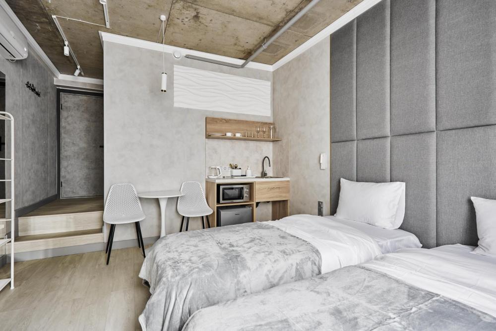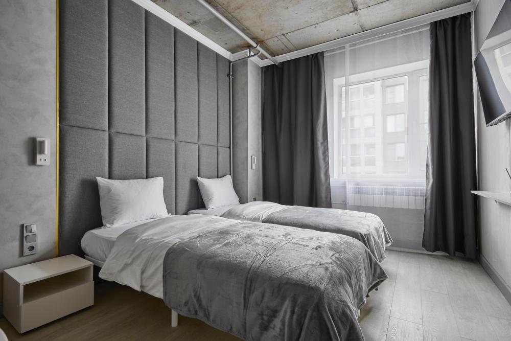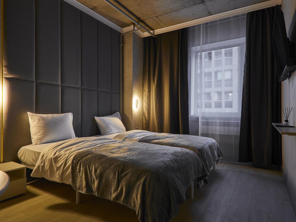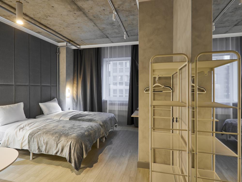Улучшенный номер (5 этаж), идеально подходящий для бизнес‑путешествий, с двумя односпальными кроватями и удобным обеденным столом, который позволит с комфортом принять пищу или организовать рабочее место. Номер выполнен с свежим ремонтом и оснащён кондиционером, телевизором, посудой, микроволновой печью и чайником. В совмещённом санузле есть душ, фен, постельное бельё, полотенца и душевые наборы. На этаже доступна общая зона с гладильной доской, утюгом и стиральной машиной. Уважаемые гости! С 22:00 до 08:00 вход в отель осуществляется по внешней лестнице