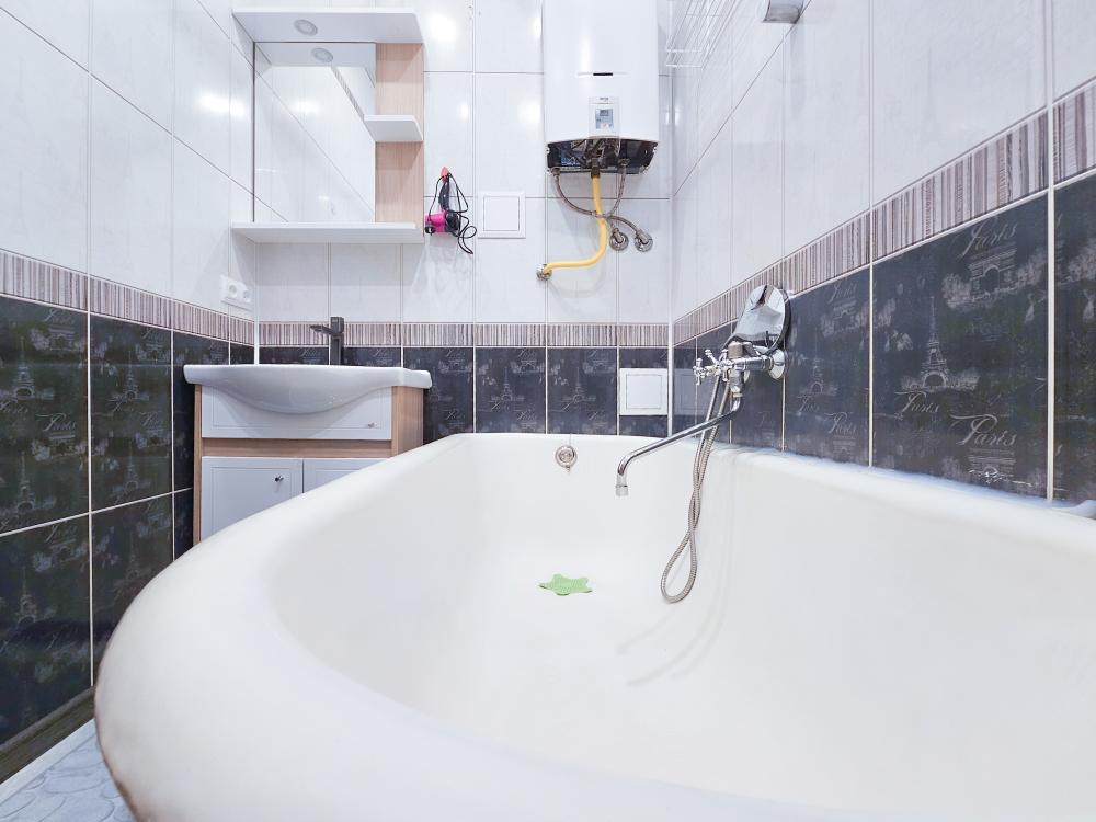 •Чугунная ванна, полотенцесушитель, мощный душ с широкой лейкой, фен, полка для мелочей.