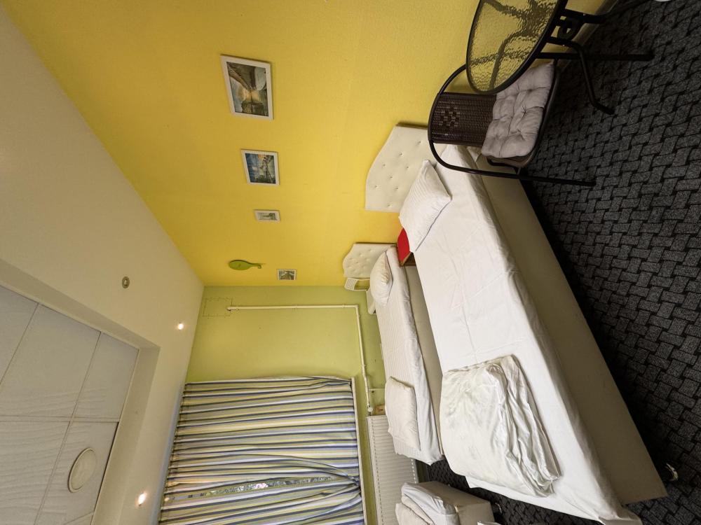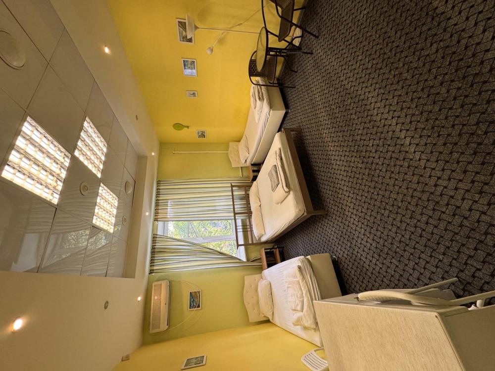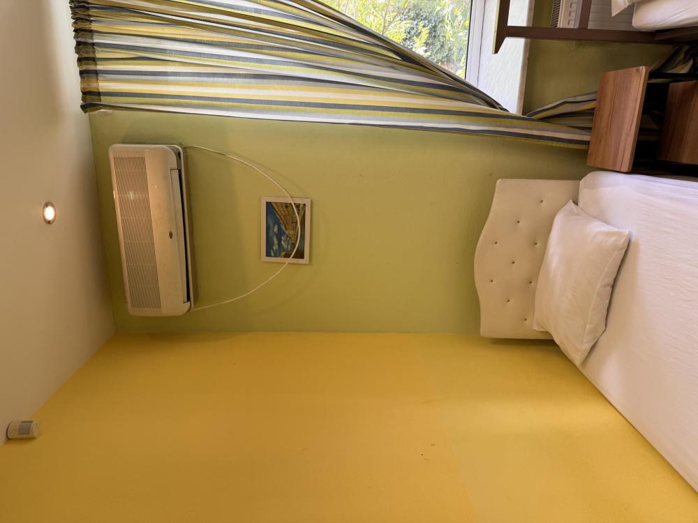 Единственная комната с отдельным санузлом и раковиной. Стеллаж, прикроватные тумбы, ящик для хранения вещей, телевизор, холодильник, гардеробная зона. Комната вмещает четыре полноценные односпальные кровати. Номер подходит для семейного размещения, максимальное количество гостей 4 человека.