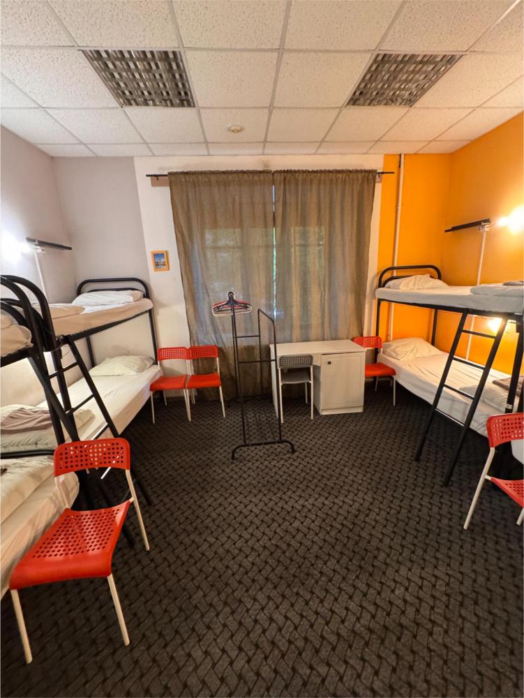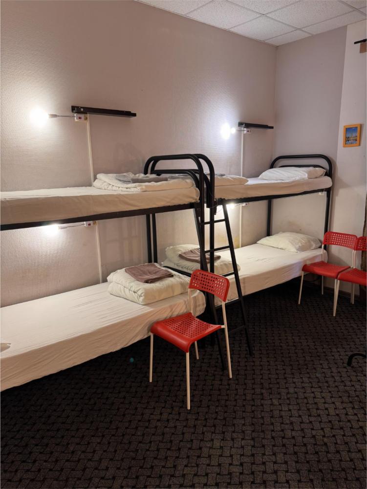Комната большой площадью с четырьмя железными черными двухъярусными кроватями с удобными матрасами, с локерами для хранения вещей. Над каждым местом установлены небольшие полки. Имеется письменный стол со стулом и осветительным прибором.