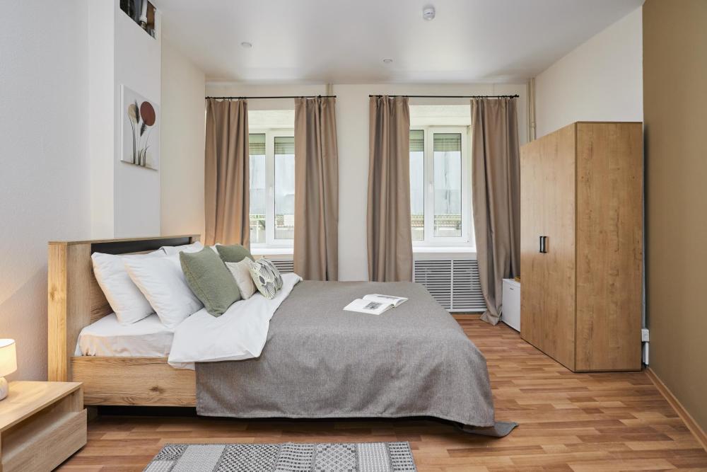 Двухместный номер комфорт общей площадью 10 кв.м. с двухспальной кроватью. Оснащение номера: двухспальная кровать, холодильник, электрический чайник, комод, вешалка для одежды. Ванная комната и туалет общие на этаже.