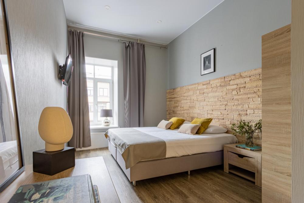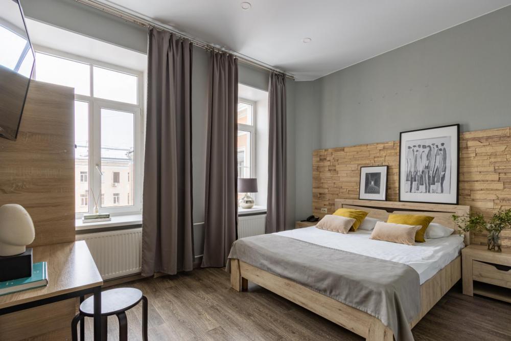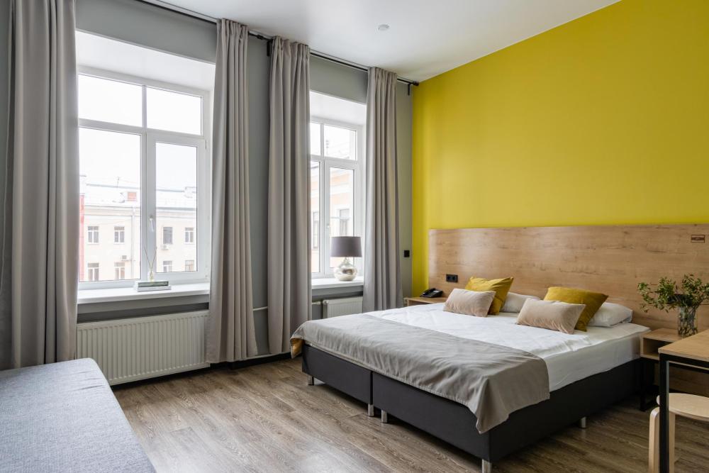 Светлые дизайнерские номера, площадью 30 м2 и высотой потолков в 4 метра, могут разместить в себе до 4-х человек Номера оборудованы Спальным гарнитуром с бесшовными матрасами, свежим постельным бельем из 100%-го хлопкового сатина. Мебелью: Шкаф или гардероб, комод, рабочий стол, стулья, как дополнительное спальное место в номере предусмотрен большой диван-кровать Техникой: ЖК-телевизор с цифровым вещанием на 56 каналов, Холодильник, Микроволновая печь — СВЧ, Электрочайник, Телефон с выходом в город. В номере есть своя ванная комната с душевой кабиной или ванной, санузлом, умывальником с зеркалом и феном для сушки волос, одноразовые принадлежности для гигиены Все что нужно для комфортного пребывания «как дома» к вашим услугам. Вид из окон номеров открывается на НЕВСКИЙ ПРОСПЕКТ!