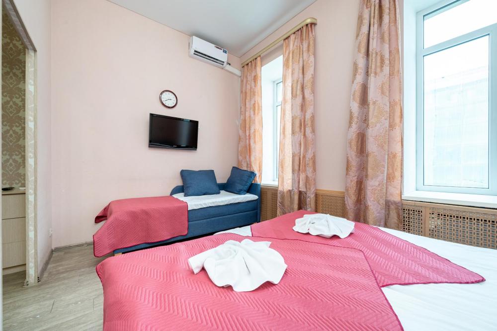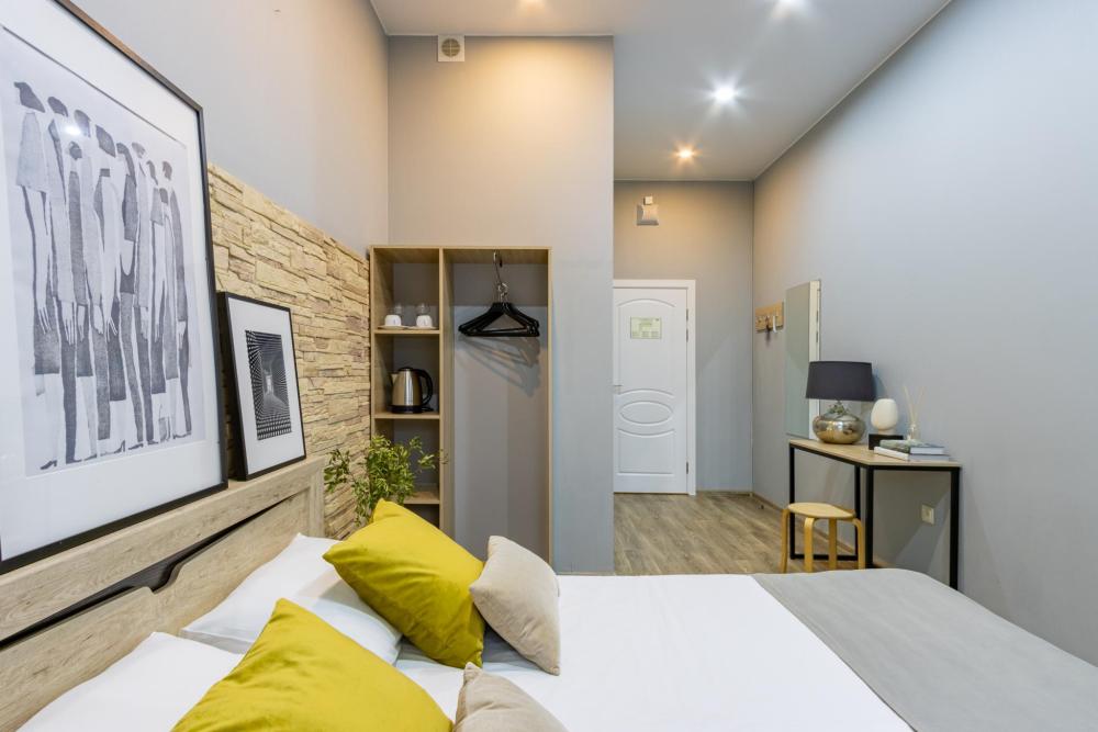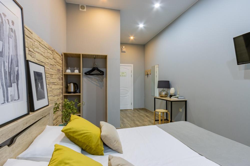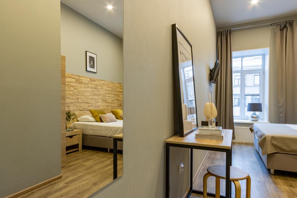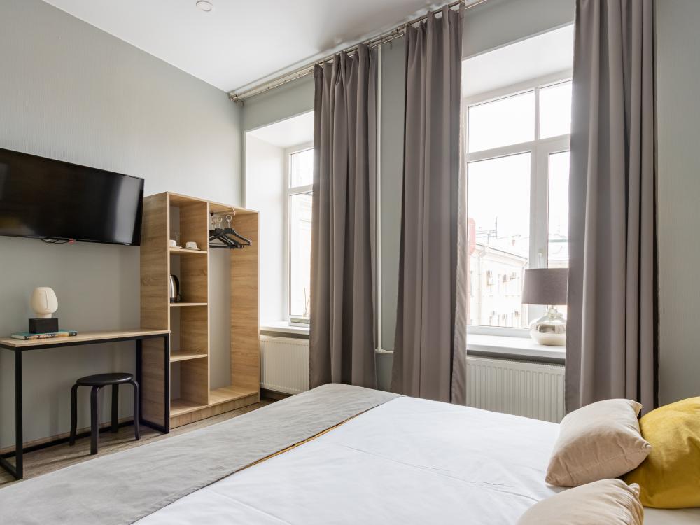 Номера категории «Стандарт Double/TWIN» площадью от 18 кв. метров, имеют классическую комплектацию данной категории с традиционным двухместным размещением; *1 большая двухместная кровать размером 1800 мм х 2000 мм., *2 раздельные односпальные кровати, размером 900х2000мм. с прикроватными тумбочками. гардеробом, рабочим столом со стульям. Номера оборудованы; ЖК телевизорами, электрочайниками, кондиционерами, феном для сушки волос. И.Т.Д. Собственная ванная комната с душем, туалетом, раковинной с зеркалом, и бесплатно предоставляется одноразовые средства гигиены, питьевая вода, гладильные принадлежности, аптечка WIFI, и многое другое Каждый номер имеет индивидуальный дизайн. Номера имеют вид из окон на достопримечательности города с видом на Невский проспект и во благоустроенный двор.