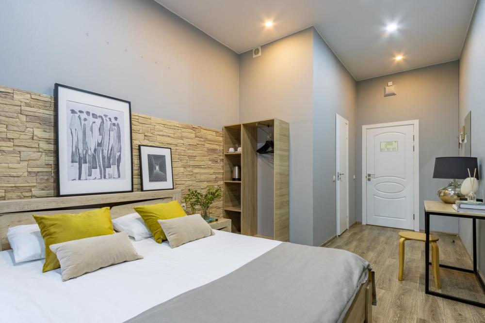 Уютный светлый номер в стиле хай‑тек рассчитан на размещение до двух гостей. Просторный номер площадью от 15 кв. м оформлен в спокойных тонах и сочетает современный дизайн с функциональностью. В номере: -большая двуспальная кровать King size (1600 × 2000 мм) с прикроватными тумбочками; -вместительный гардероб; -удобный рабочий стол; -ЖК‑телевизор. В собственной ванной комнате вы найдёте душ, туалет, раковину с зеркалом и фен. Для вашего комфорта мы предоставляем: -одноразовые средства гигиены; -питьевую воду; -гладильные принадлежности; -аптечку; -бесплатный Wi‑Fi. Вид из окон номера открывается на Невский проспект или внутренний двор отеля.