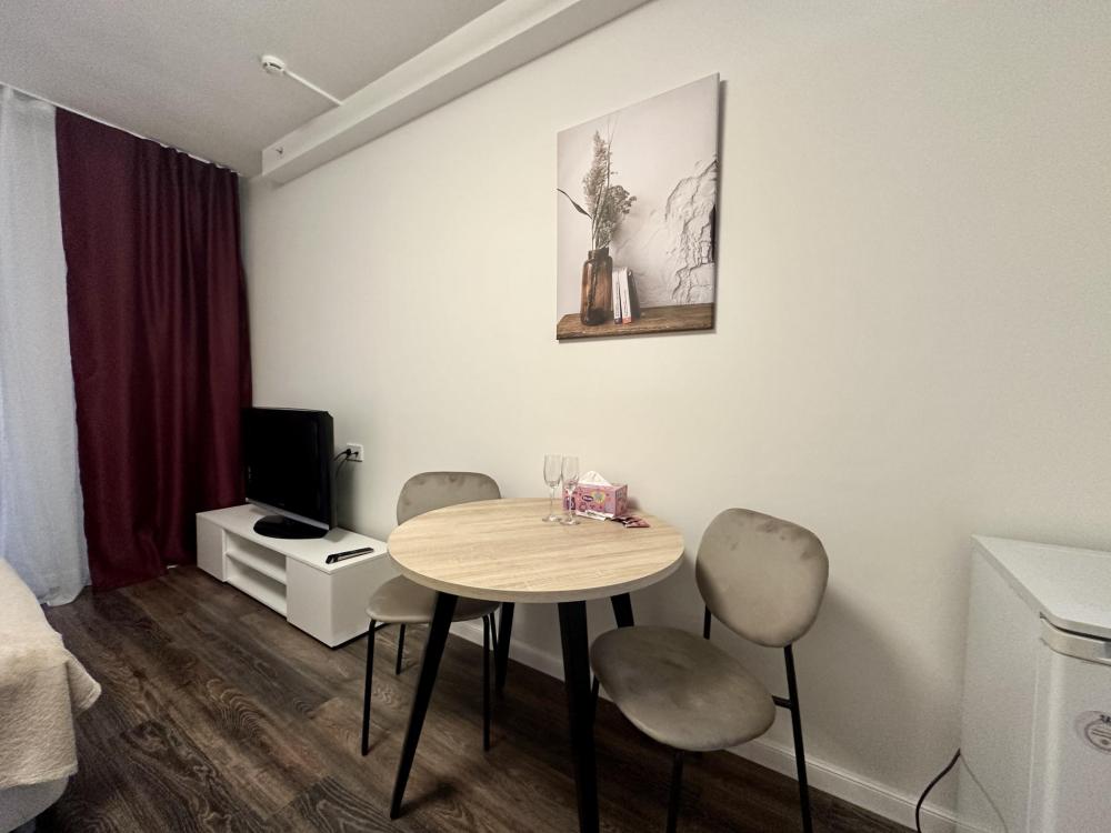 Апартаменты студия с кроватью размера king size. Номер оснащен балконом, телевизором, местом для хранения одежды, ванной комнатой, предоставляются туалетно-косметические принадлежности. Все необходимое для комфортного проживания.
