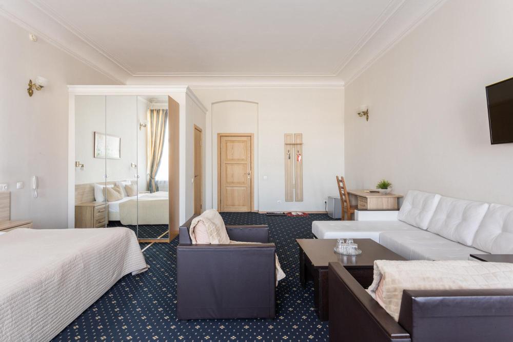 Семейный номер рассчитан на троих гостей, со своими удобствами (душ, туалет в номере) и кухней. В номере установлены 1 двуспальная кровать и 1 односпальная, шкаф, прикроватные тумбочки , журнальный столик, светильники, ТВ, WI — FI.