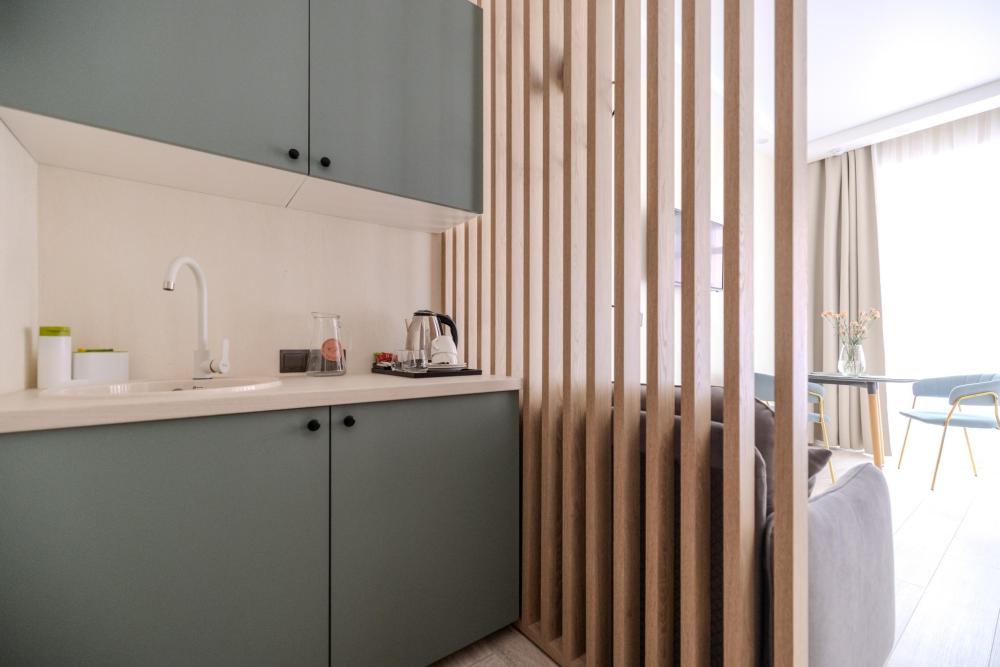 Современная мебель и сантехника, мини-кухня с индукционной панелью, телефон, ТВ, душевая кабина или ванна, махровые халаты, фен, тапочки, банные принадлежности, сейф, WiFi интернет.