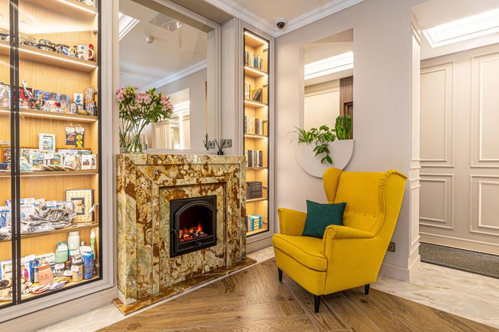 Современная мебель и сантехника, телефон, ТВ, душевая кабина, фен, халаты, тапочки, банные принадлежности, сейф, Wi-Fi, холодильник, кондиционер, одна двуспальная кровать. Окна номера выходят на арку во внутреннем дворе.