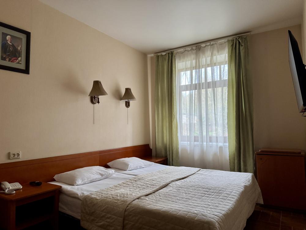 Продуманная обстановка и уютный интерьер номера класса «Стандарт» позволяют нашим гостям чувствовать себя в отеле как дома, а тишина «зеленой» зоны, уединение и по-домашнему теплая атмосфера — отдыхать с удовольствием. Категория «Стандарт» — недорогие номера с двумя кроватями, которые могут быть составлены как вместе, так и порознь. Номера этой категории имеют площадь 13-14 кв. м. В номере «Стандарт» есть все, что необходимо для комфортного проживания: шкаф для одежды, письменный стол, два мягких кресла, телефон и телевизор, беспроводной интернет (Wi-Fi). В ванной комнате: душ, умывальник, туалет, набор полотенец, мыло, шампунь.