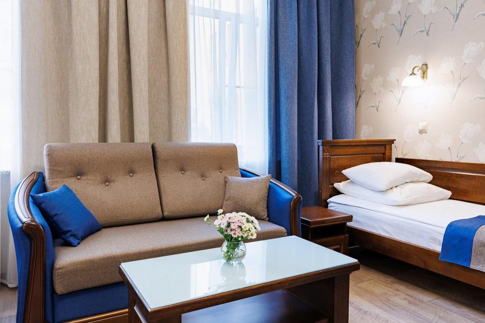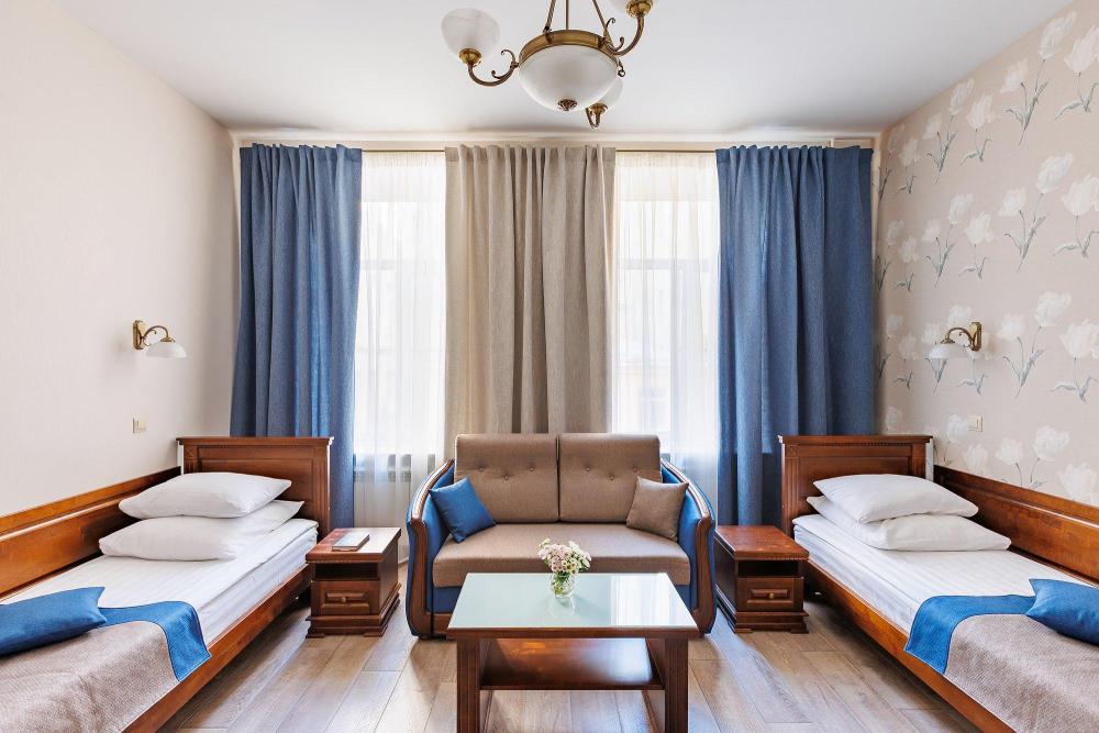Номер повышенной комфортности с двумя односпальными кроватями и диваном. В номере собственная ванная комната, кондиционер, холодильник, сейф, чайная станция с набором для чая. Гостям предоставляются халаты.