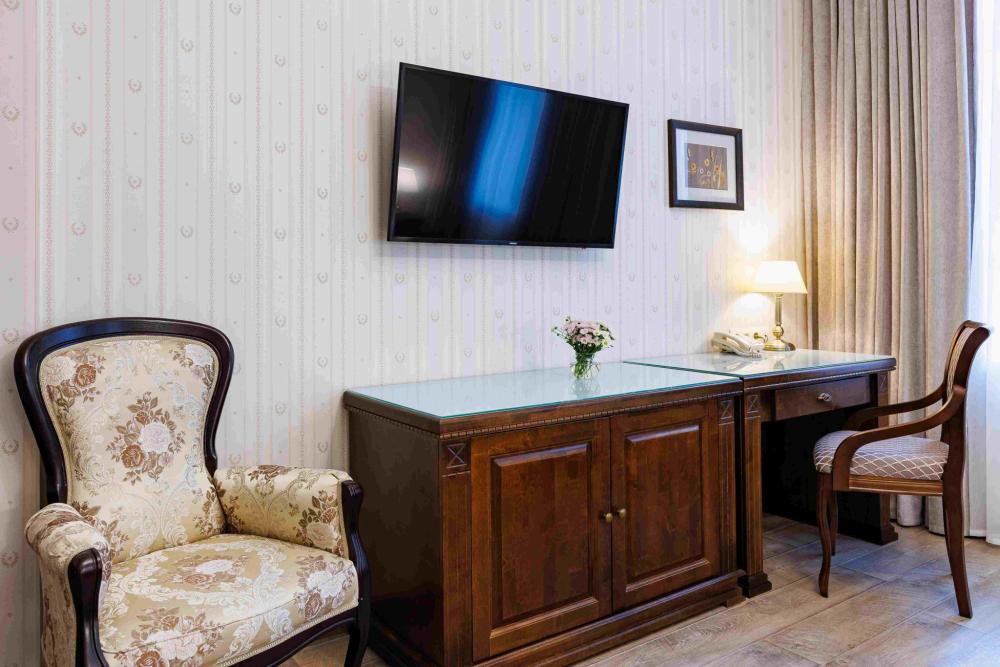 Комфортный двухместный номер с одной двуспальной кроватью размера "king-size" и с собственной ванной комнатой. В номере чайная станция с принадлежностями для чая, сейф, холодильник, кондиционер. Гостям предоставляются купальные халаты.