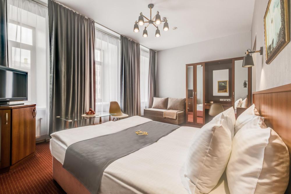 Номер 20 кв.м. с двуспальной кроватью и диваном. Есть встроенная кухня. В номере большие окна с видом на Лиговский проспект или во двор отеля. Во дворе есть парковка (количество мест ограничено, не бронируются). Подходит для длительного проживания во время отпуска или командировки: есть посуда для приема и приготовления пищи, большой ТВ, сейф, WiFi. В санузле ванна, биде, туалет, фен, комплект свежих полотенец.