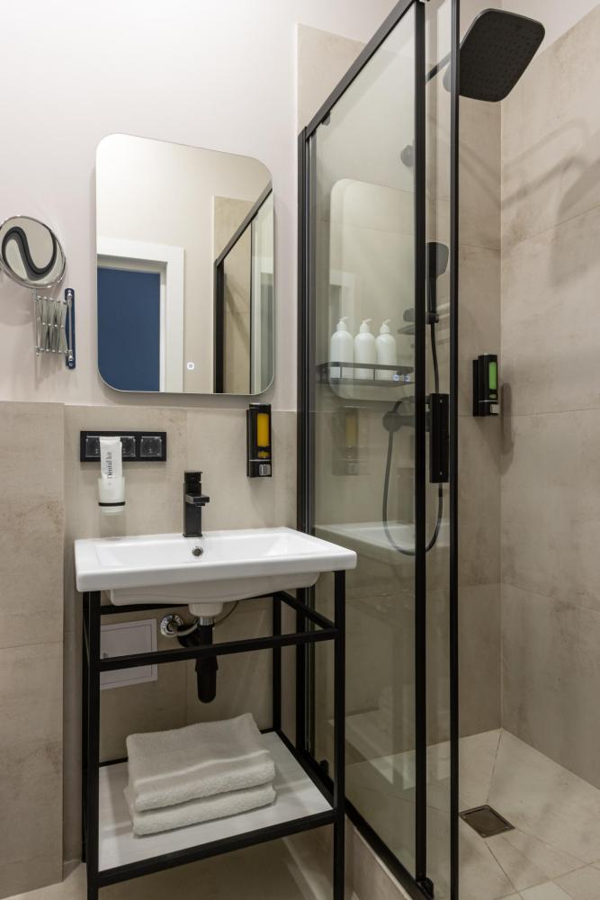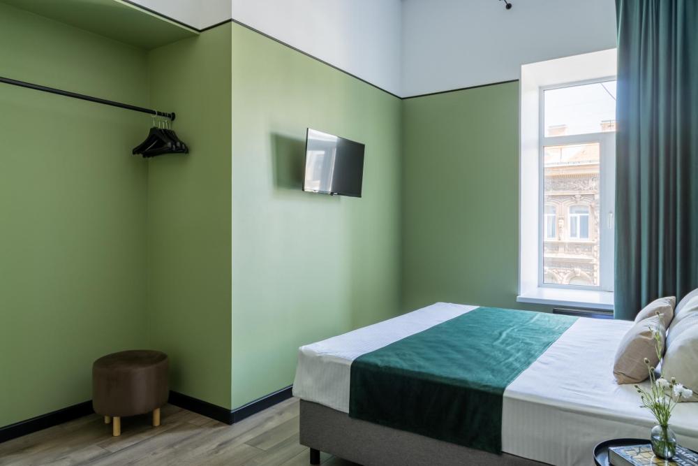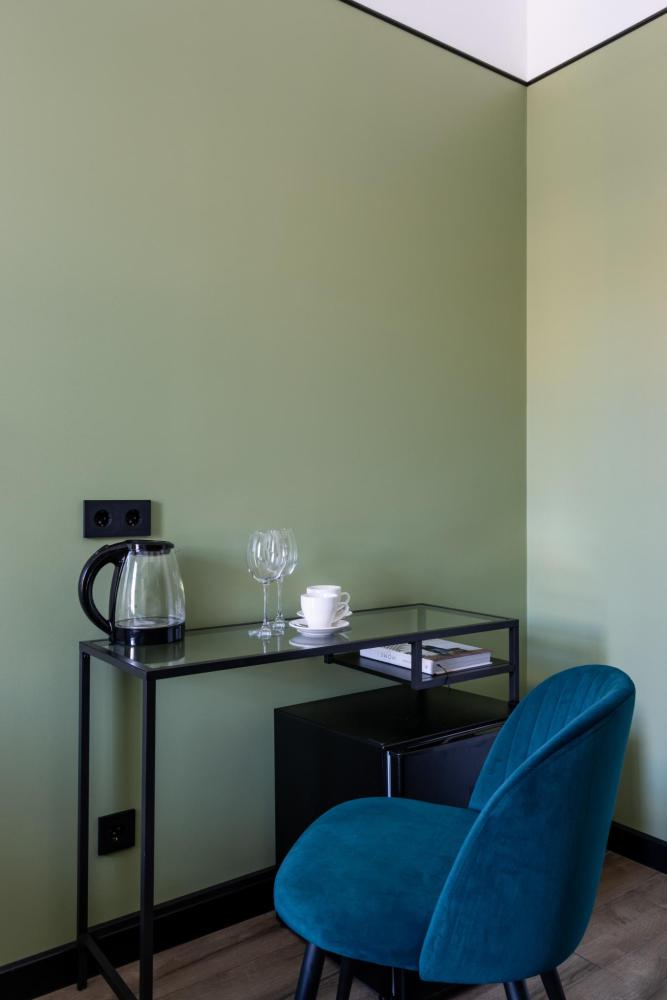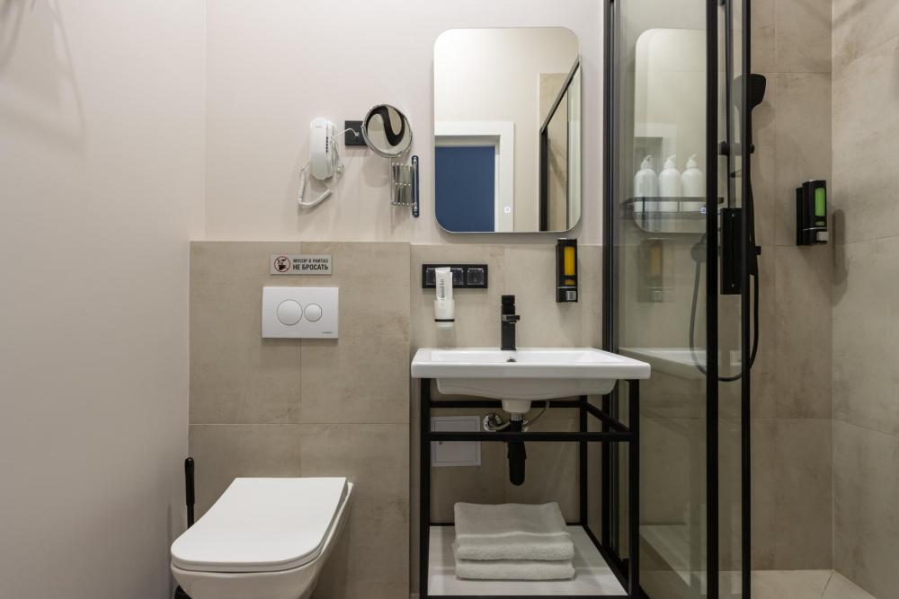 Номер оборудован маленьким окном и оформлен в спокойных тонах. Пространство организовано так, чтобы обеспечить гостям всё необходимое для комфортного пребывания. В номере: электрочайник, телевизор, зеркало, комплект полотенец, набор гигиенических средств, тапочки, бокалы. Ванная комната оснащена: душевой кабиной, феном, туалетными принадлежностями.