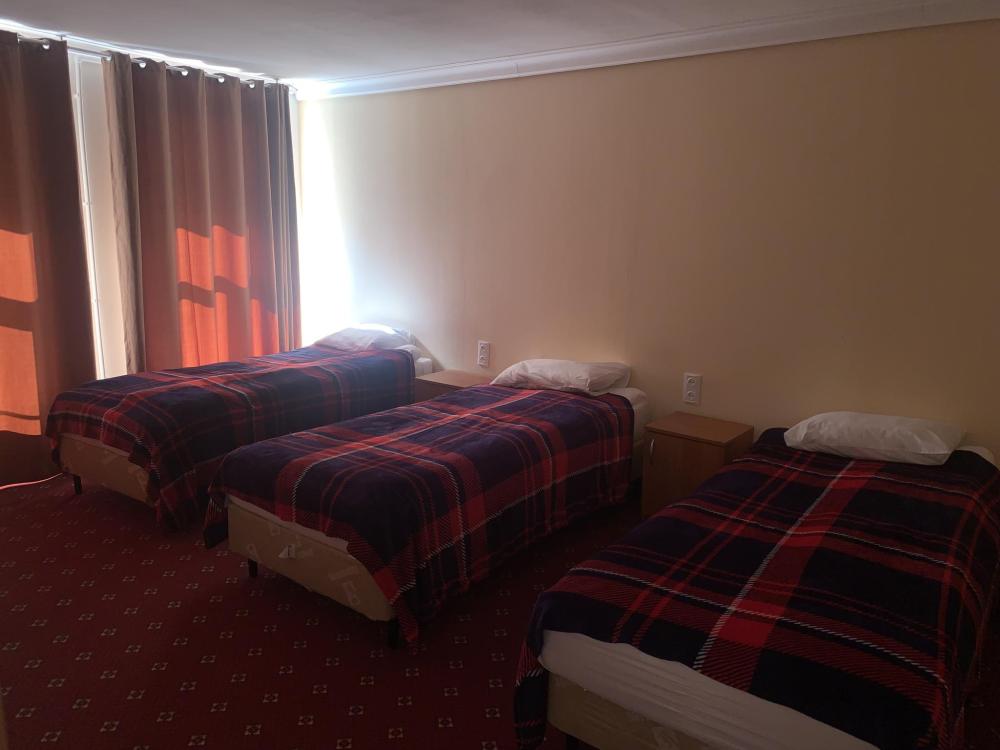 Трехместный номер с тремя односпальными кроватями. Общие удобства находятся на этаже.