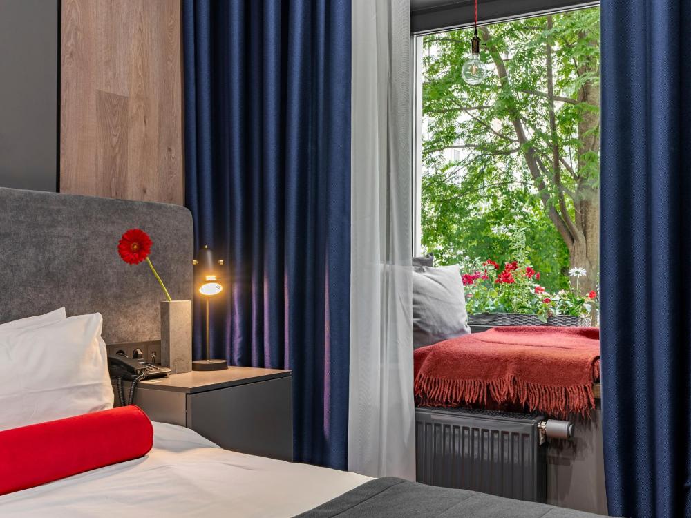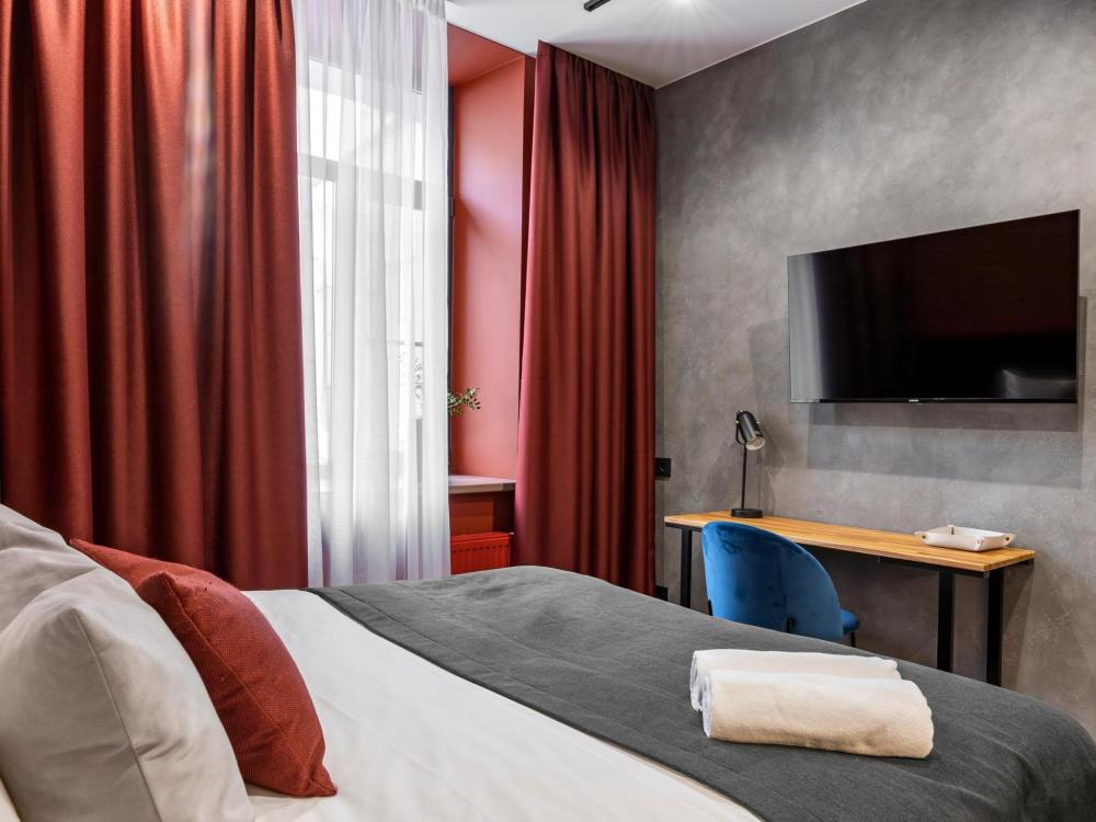 Для 1-2 гостей (двуспальная кровать ). Номер оснащен техникой: кондиционер, плазменный ТВ, мини-холодильник, чайная станция, фен и сейф. Вид в тихий внутренний двор. Площадь номера: 15 кв. м.