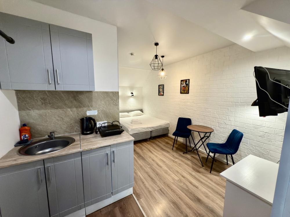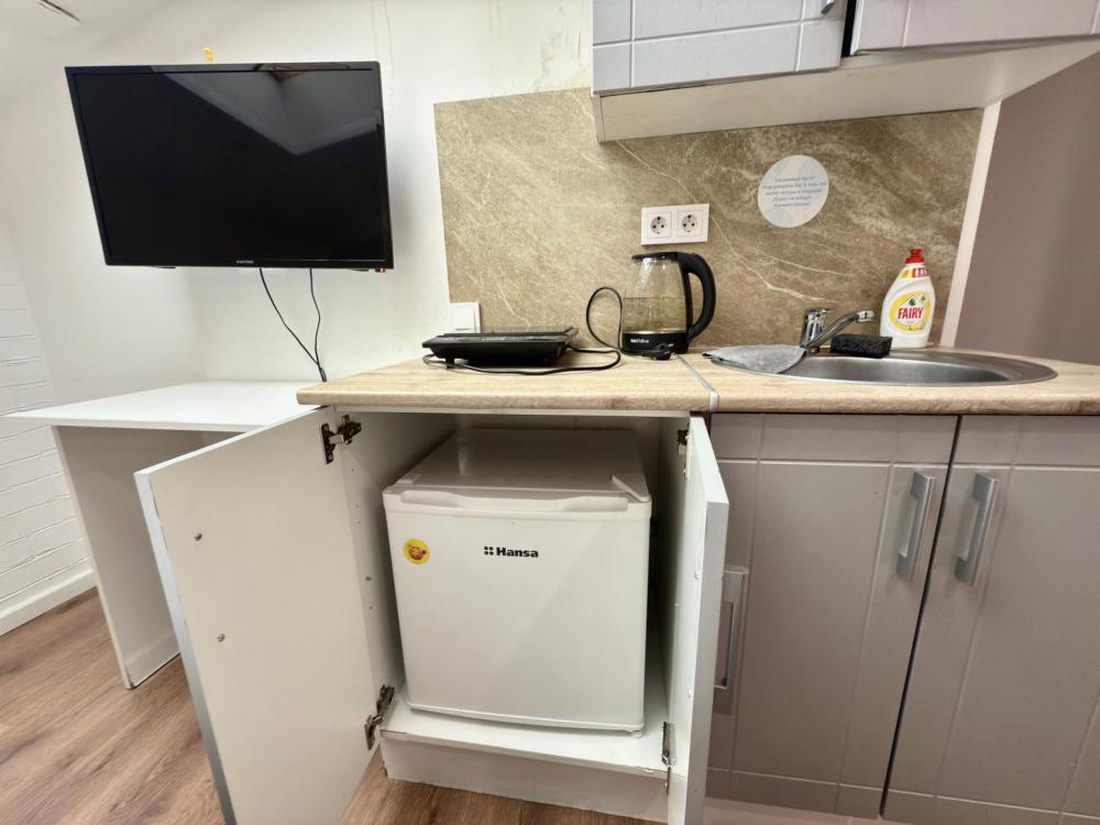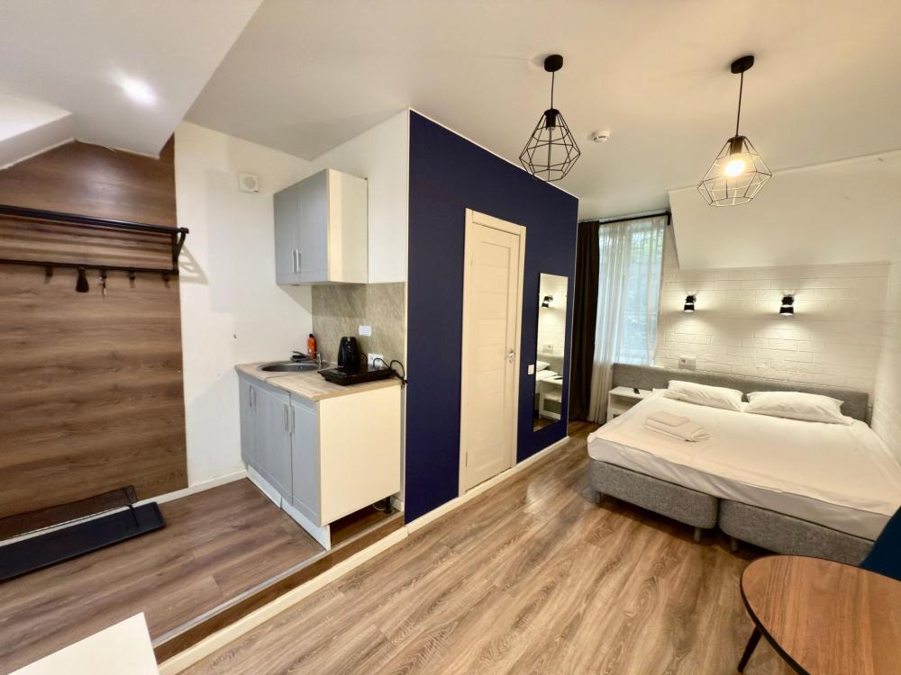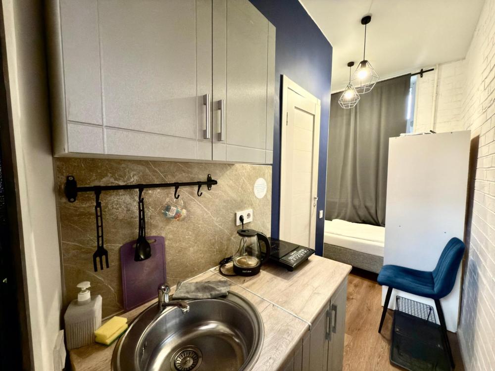 Одноместный номер для одного гостя. Апартаменты оборудованы кухонной зоной, где есть собственная мойка и холодильник, а также настольная индукционная плита и электрический чайник. Помимо этого, в каждых апартаментах есть стандартный набор посуды для приготовления пищи и сервировки стола.
