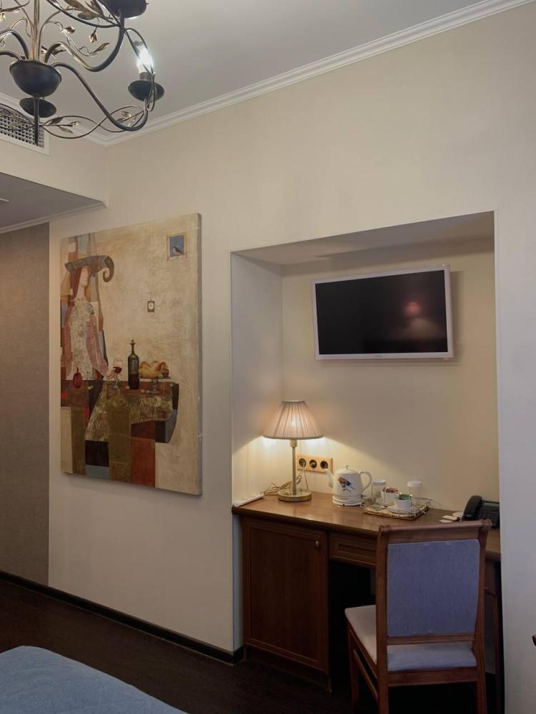 Комплектация жилой комнаты – две кровати или одна двуспальная кровать, большой письменный стол, мягкое кресло, телевизор, телефон, стул, две тумбочки, мини-бар, кондиционер, шкаф, вешалка, зеркало, система кондиционирования Climate Control, сейф. Комплектация ванной комнаты – душевая кабина, гигиенический душ, фен, набор полотенец, набор индивидуальной косметики (шампунь, мыло, лосьон для тела, бальзам для волос, гель для душа, зубная щетка и паста), махровый халат, тапочки. Wi-Fi и международная телефонная связь – бесплатно Вид из окон – на Андреевский собор и пешеходную 6-ю линию.