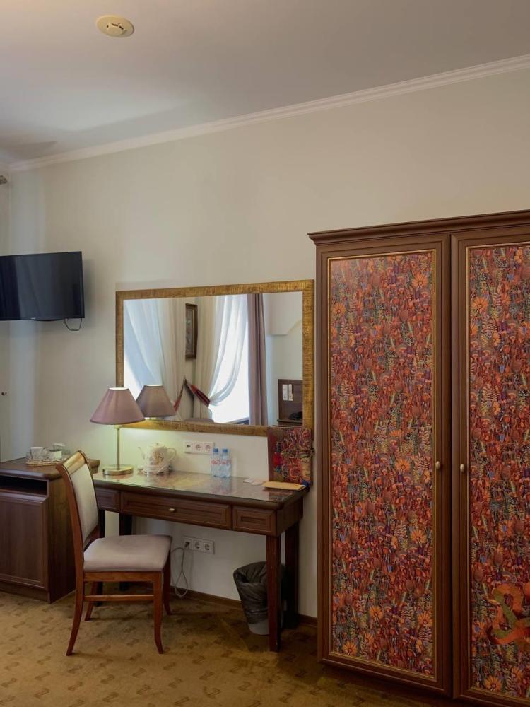 Лучшее решение для приема групп: несмотря на индивидуальный подход к дизайну комнат, все 6 номеров имеют однотипную комплектацию: кровати, тумбочки, письменный стол, два полукресла, багажная тумба, телевизор (15 дюймов экран), мини бар, сейф, телефон, система кондиционирования climate control; приточно-вытяжная вентиляция. Ванная комната с душевой кабиной, гигиеническим душем, феном, набором полотенец и индивидуальной косметики.