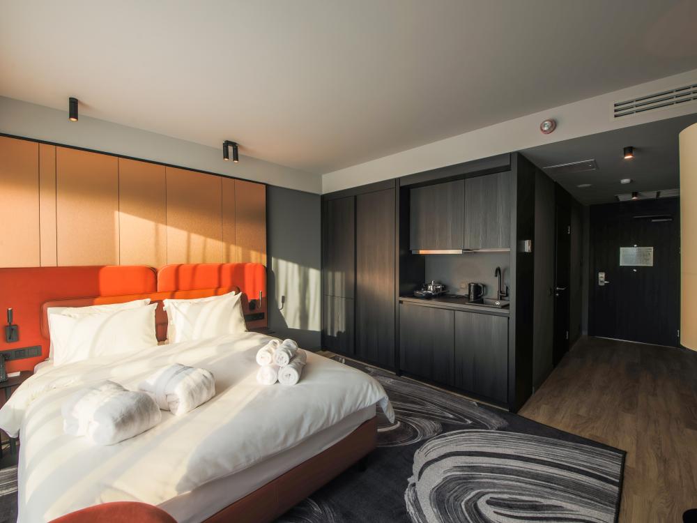 Номер Комфорт в отеле Mercure представляет собой прекрасное место для отдыха и расслабления. Мебель в номере выполнена в терракотовом цвете, что придает ему особый шарм и элегантность. В номере также есть удобное рабочее место, где гость может выполнять свои деловые задачи или просто расслабиться с книгой или журналом. мягкие подушки добавляют уюта. В номере также есть удобное рабочее место, где гость может выполнять свои деловые задачи или просто расслабиться с книгой или журналом. Ванная комната оснащена современной душевой системой и качественной немецкой сантехникой Все необходимое - фен, туалетные принадлежности и полотенца - предоставляются для удобства гостей. Изысканная косметика порадует гостей своим тонким ароматом и качественным уходом. Все номера этой категории оснащены полноценной кухней, на которой гости могут приготовить себе еду и напитки. Кухня оснащена бытовой техникой (холодильник, СВЧ-печь, плита), посудой для приготовления и сервировки, столовыми приборами. В ванной комнате дополнительно установлена стиральная машина.