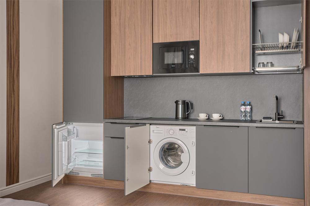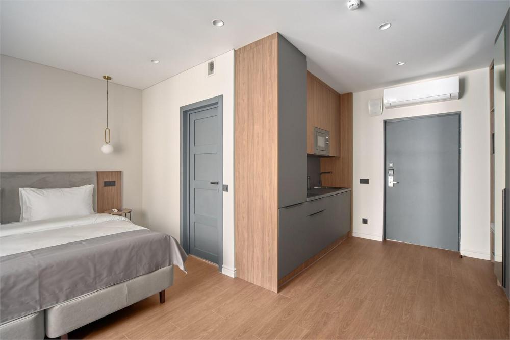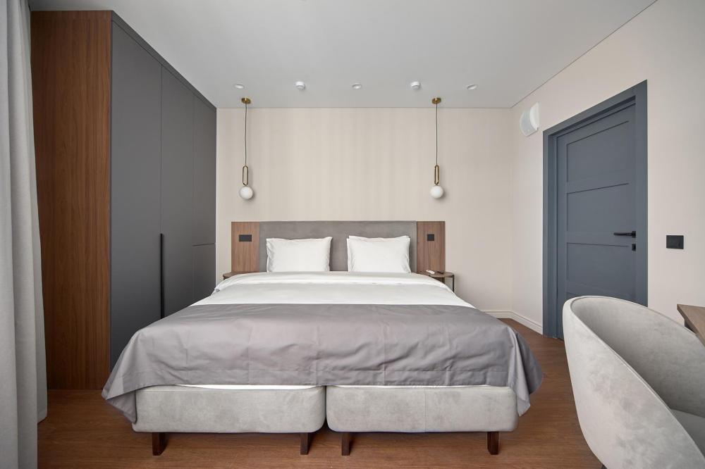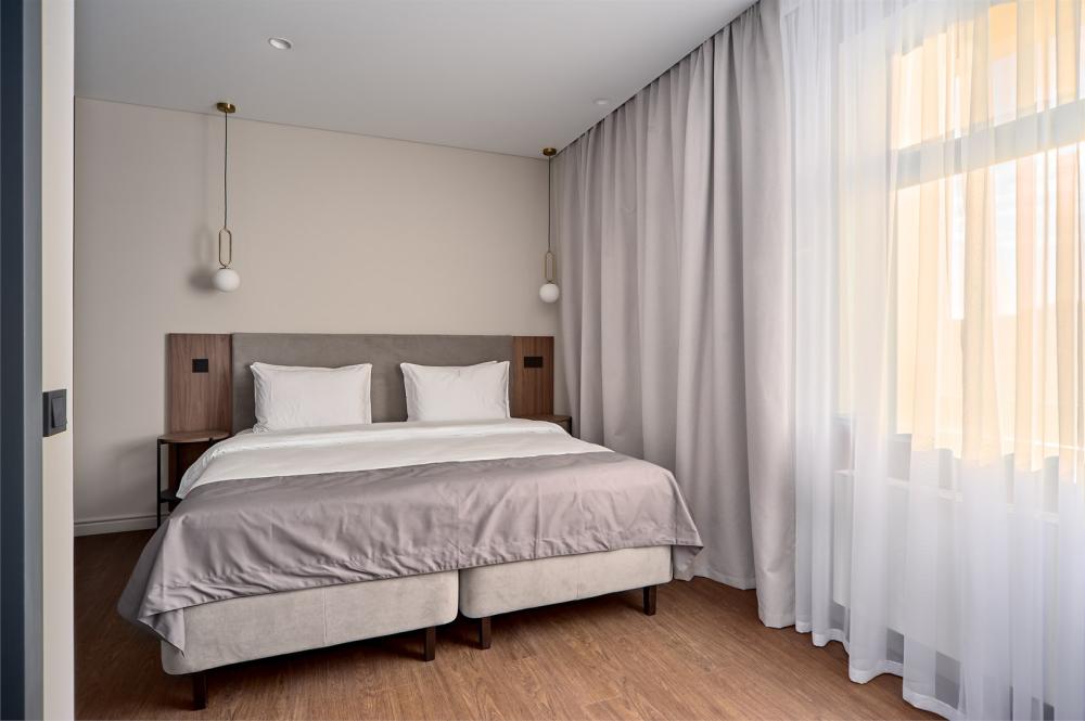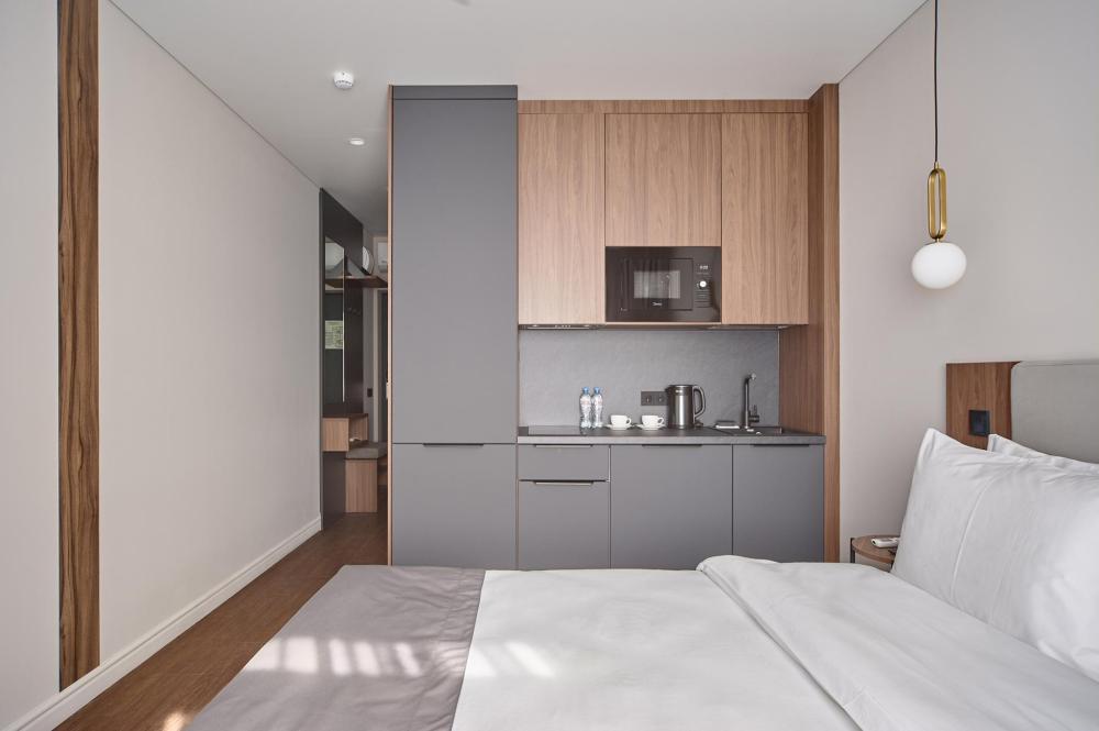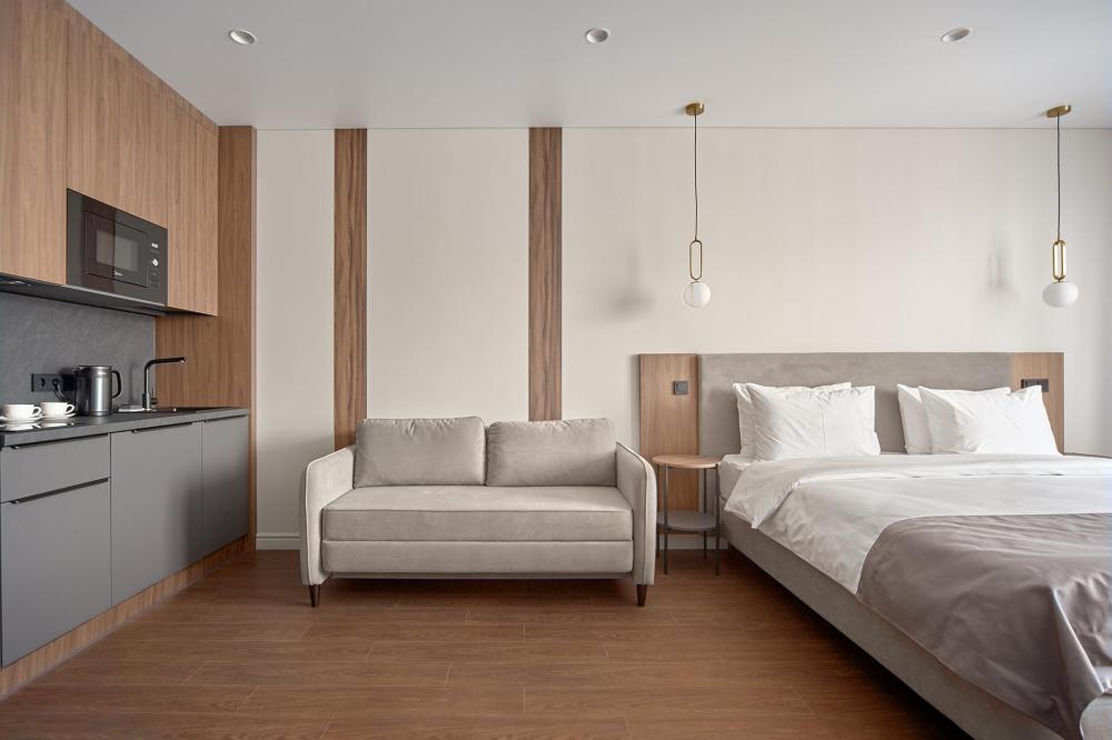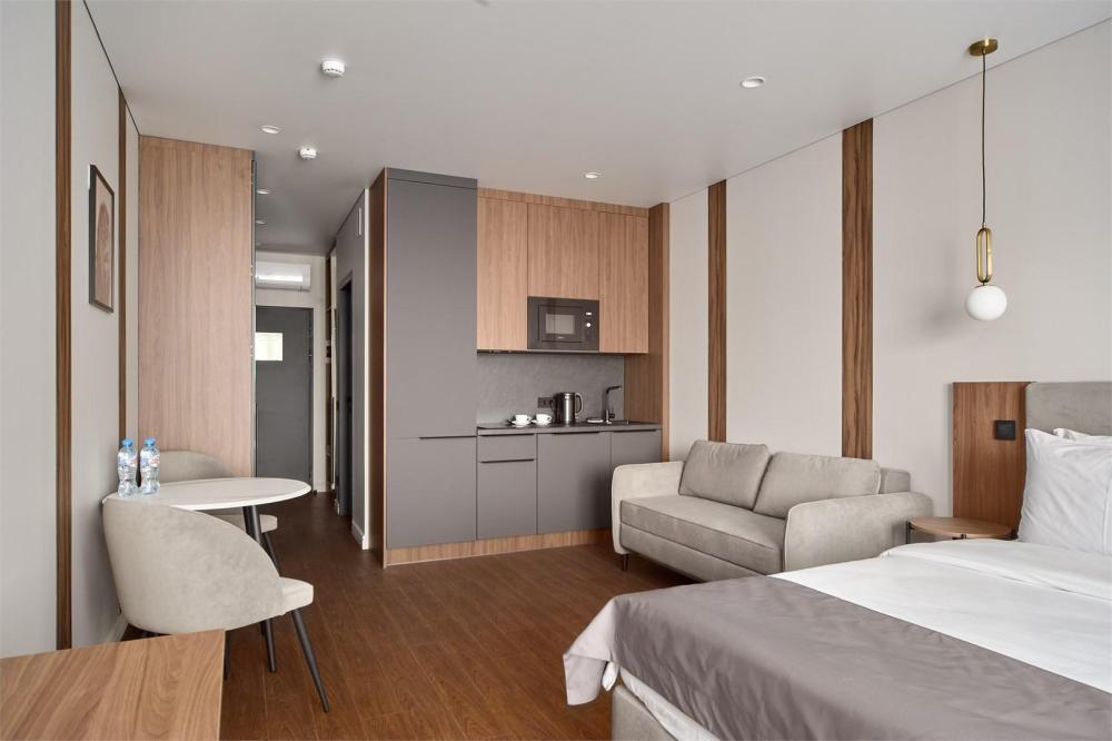 Комфортабельные и просторные двухместные апартаменты площадью от 33-36 кв.метров. Каждый номер оснащен двуспальной кроватью, обеденной зоной, кухонным уголком со всем необходимым. В каждом номере - чайник, микроволновая печь, холодильник, плита для приготовления пищи, посуда, столовые приборы. Ванная комната оснащена качественной сантехникой, всеми необходимыми туалетными принадлежностями, махровыми полотенцами и тапочками.