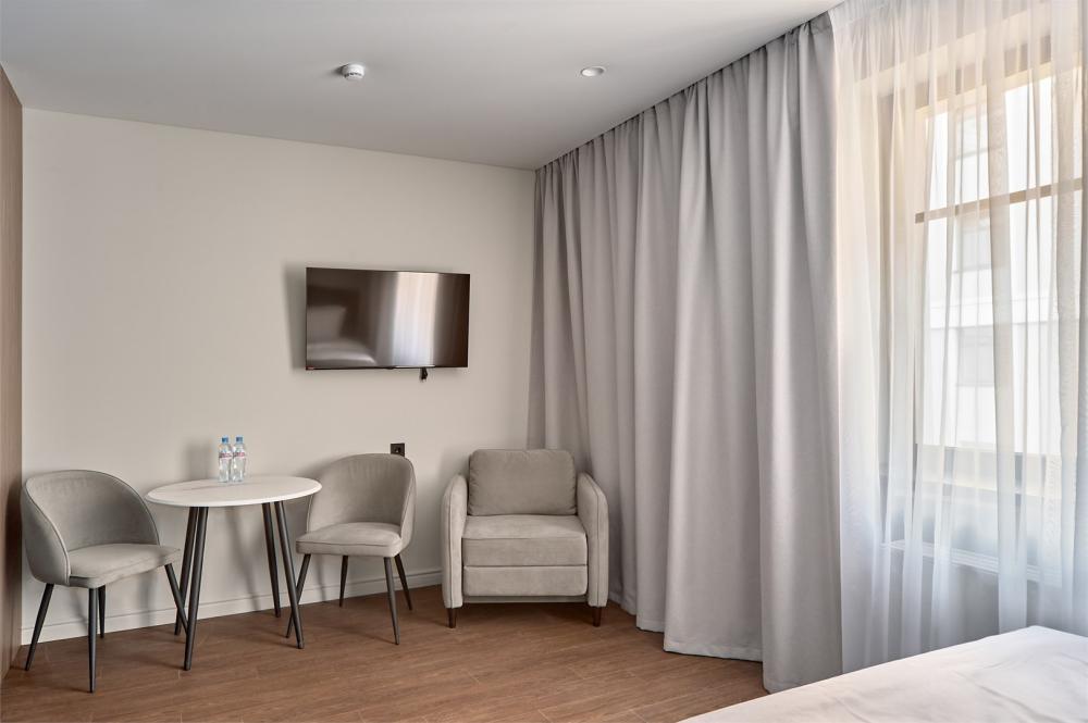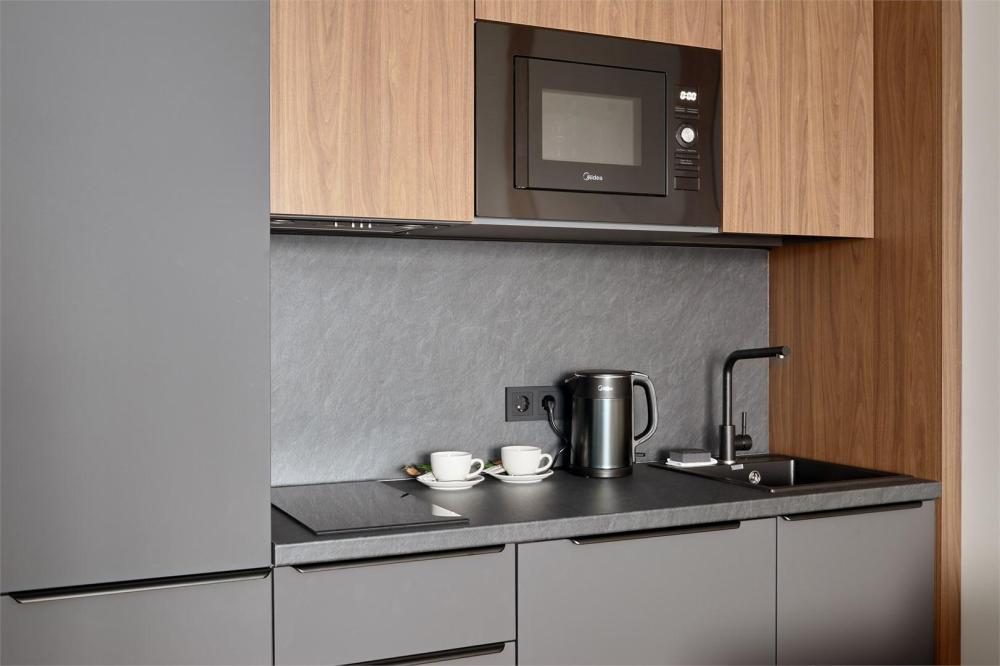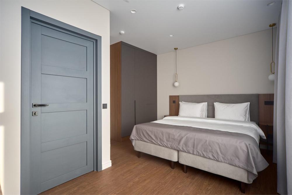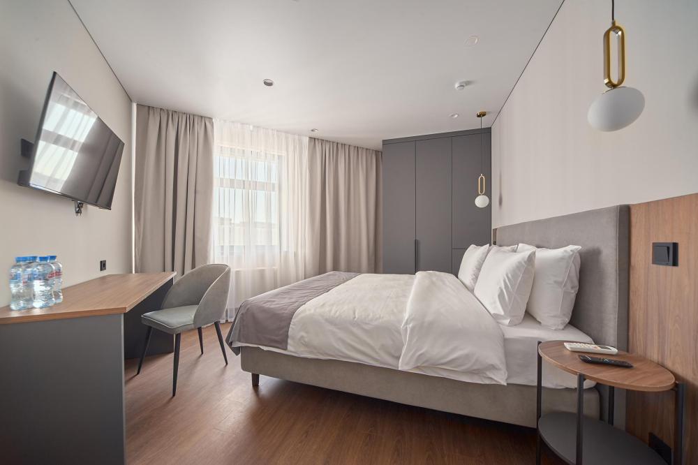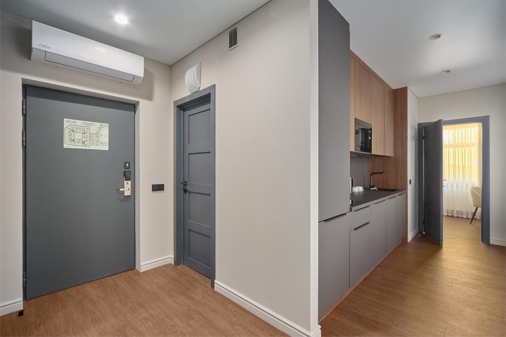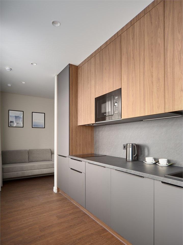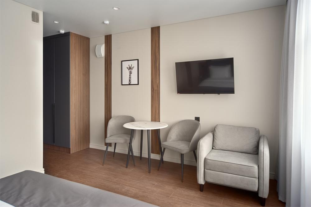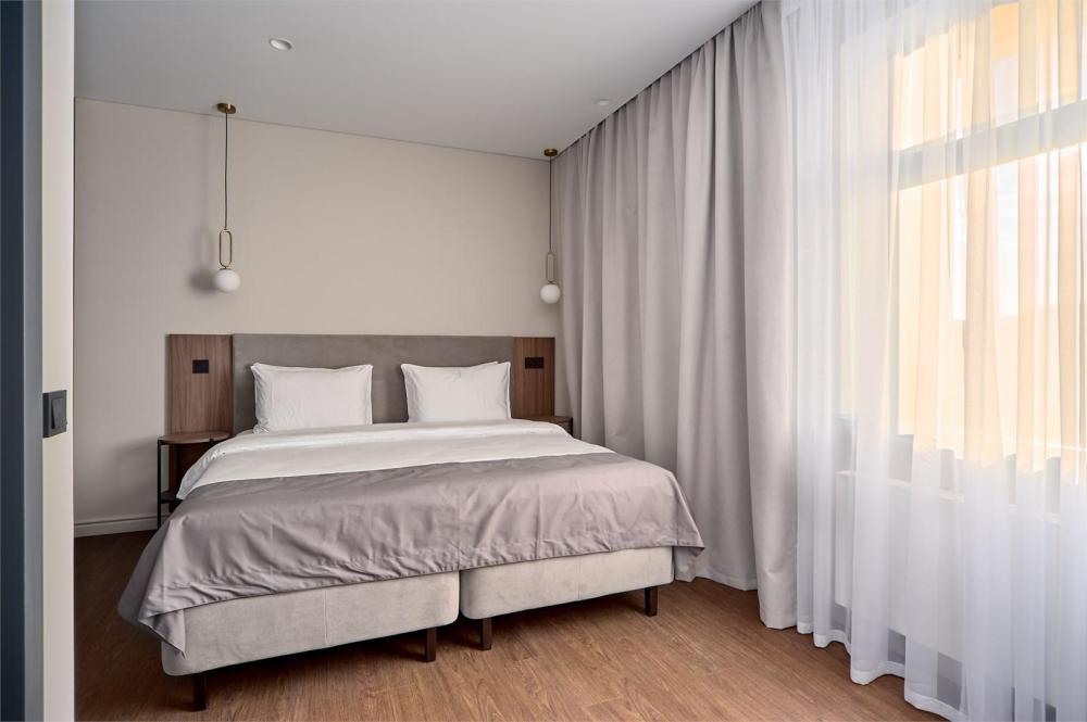 Комфортабельные и просторные двухместные апартаменты площадью от 33-36 кв.метров. Каждый номер оснащен двуспальной кроватью, обеденной зоной, кухонным уголком со всем необходимым. В каждом номере - чайник, микроволновая печь, холодильник, плита для приготовления пищи, посуда, столовые приборы. Ванная комната оснащена качественной сантехникой, всеми необходимыми туалетными принадлежностями, махровыми полотенцами и тапочками.