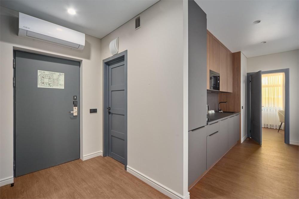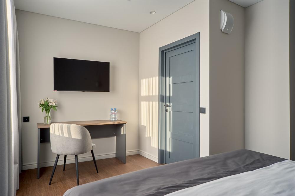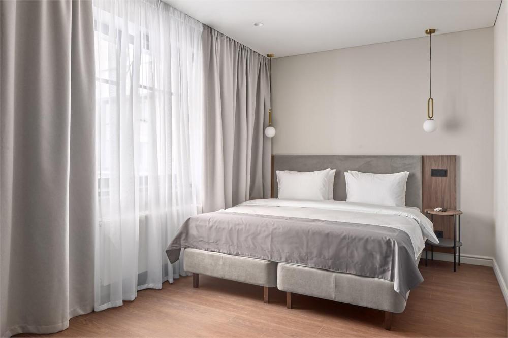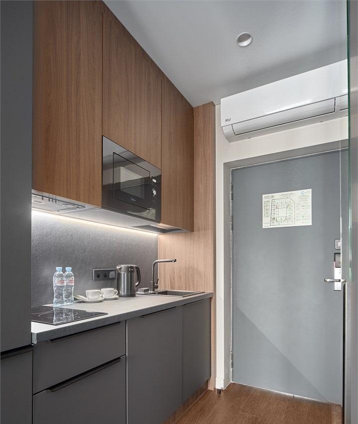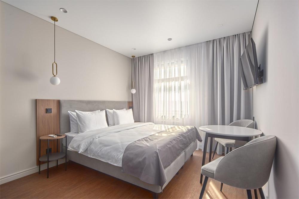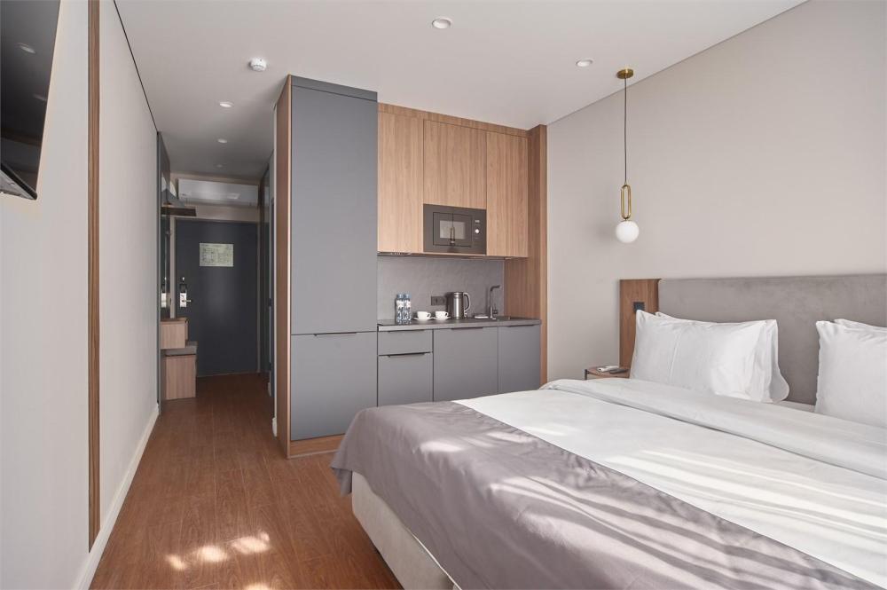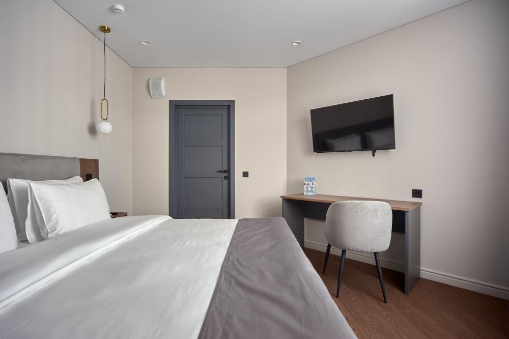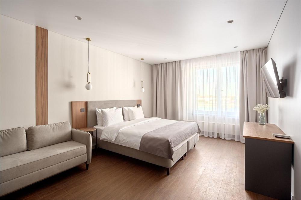 Комфортабельные и просторные двухместные апартаменты площадью от 33-36 кв.метров. Каждый номер оснащен двуспальной кроватью, обеденной зоной, кухонным уголком со всем необходимым. В каждом номере - чайник, микроволновая печь, холодильник, плита для приготовления пищи, посуда, столовые приборы. Ванная комната оснащена качественной сантехникой, всеми необходимыми туалетными принадлежностями, махровыми полотенцами и тапочками.