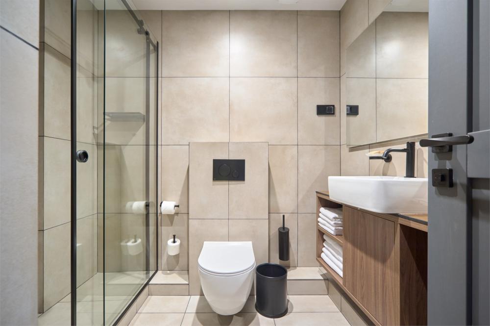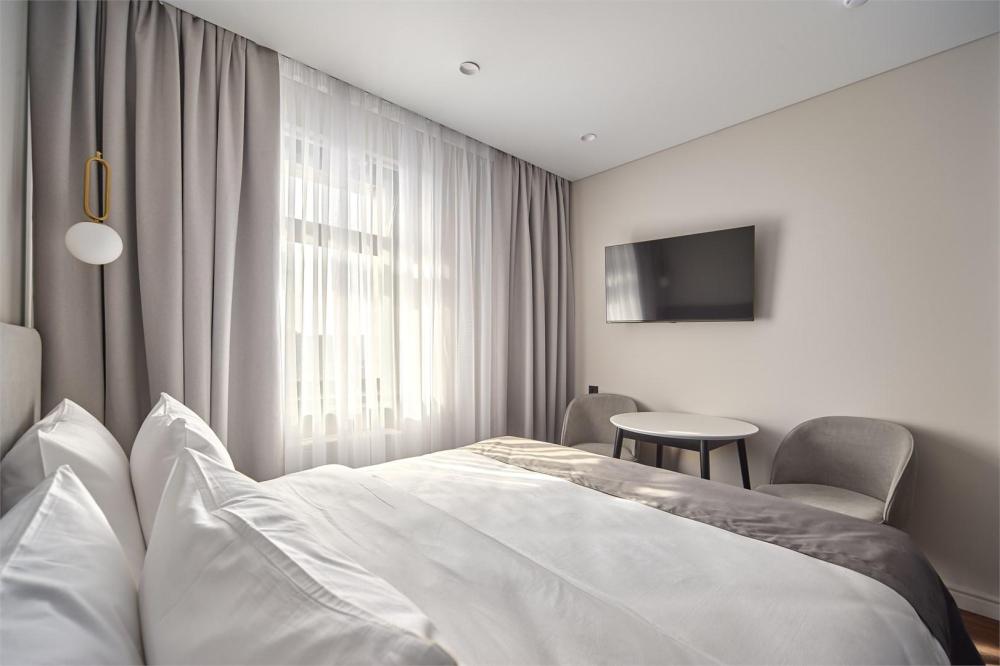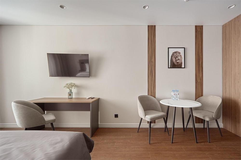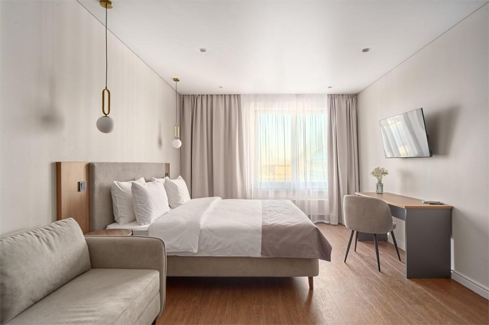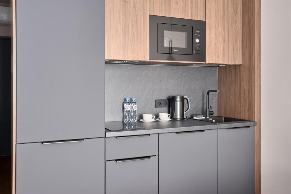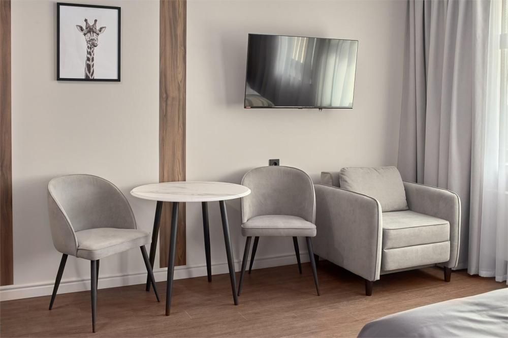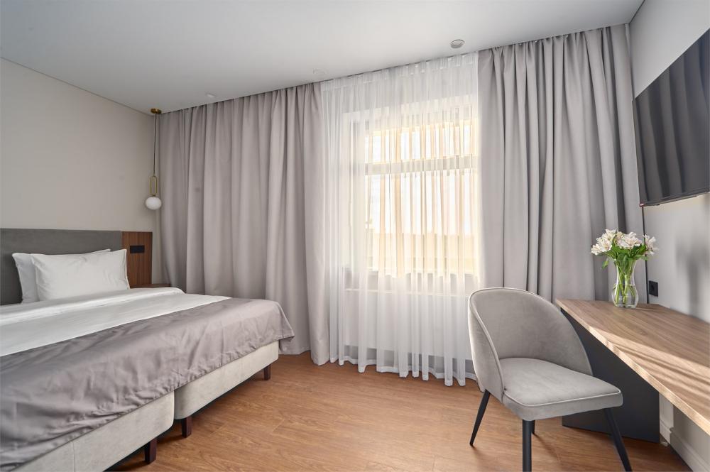 Комфортабельные и просторные двухместные апартаменты площадью от 33-36 кв.метров. Каждый номер оснащен двуспальной кроватью, обеденной зоной, кухонным уголком со всем необходимым. В каждом номере - чайник, микроволновая печь, холодильник, плита для приготовления пищи, посуда, столовые приборы. Ванная комната оснащена качественной сантехникой, всеми необходимыми туалетными принадлежностями, махровыми полотенцами и тапочками.
