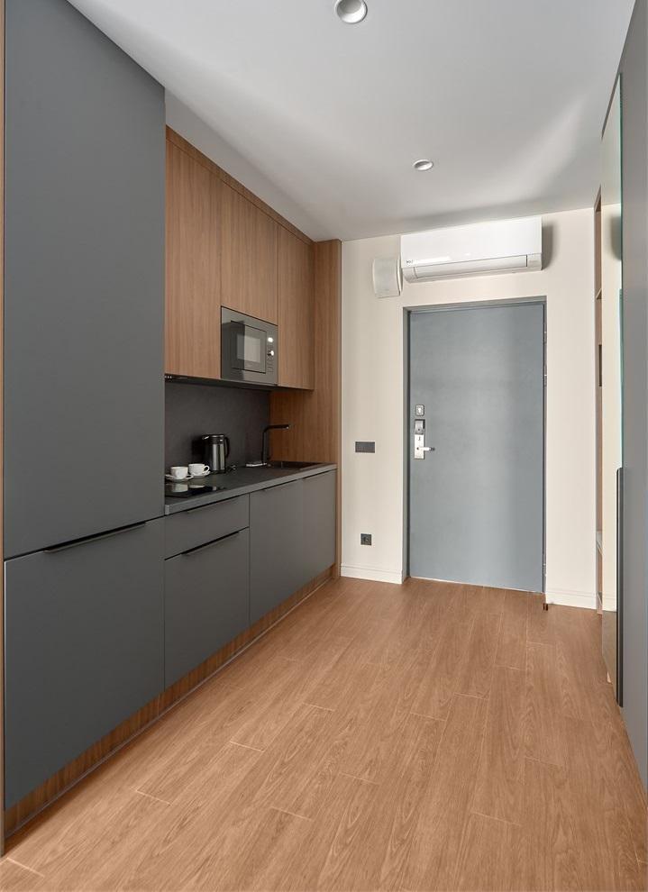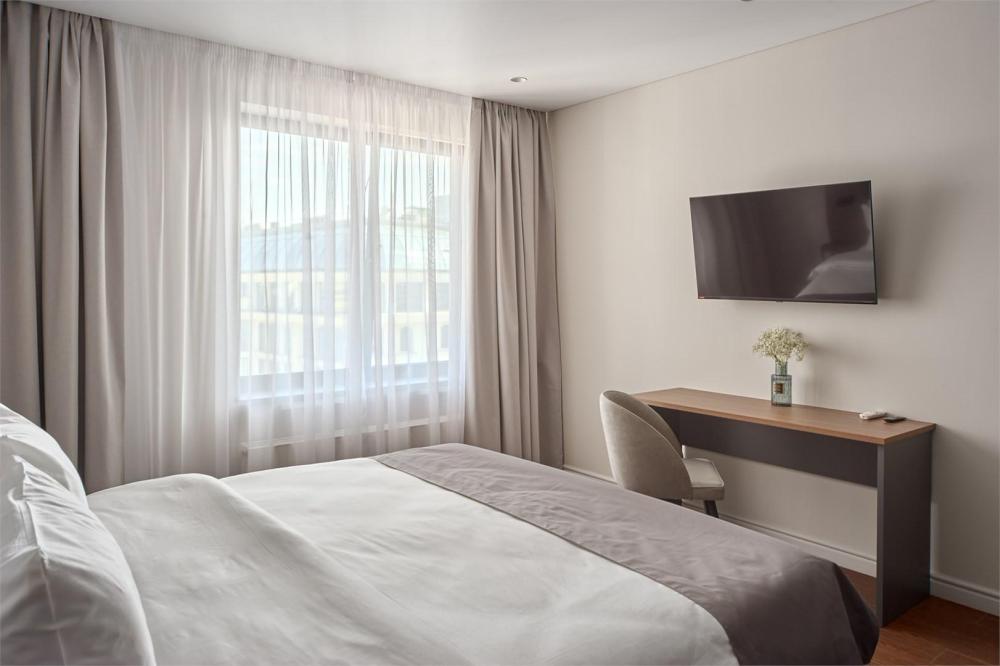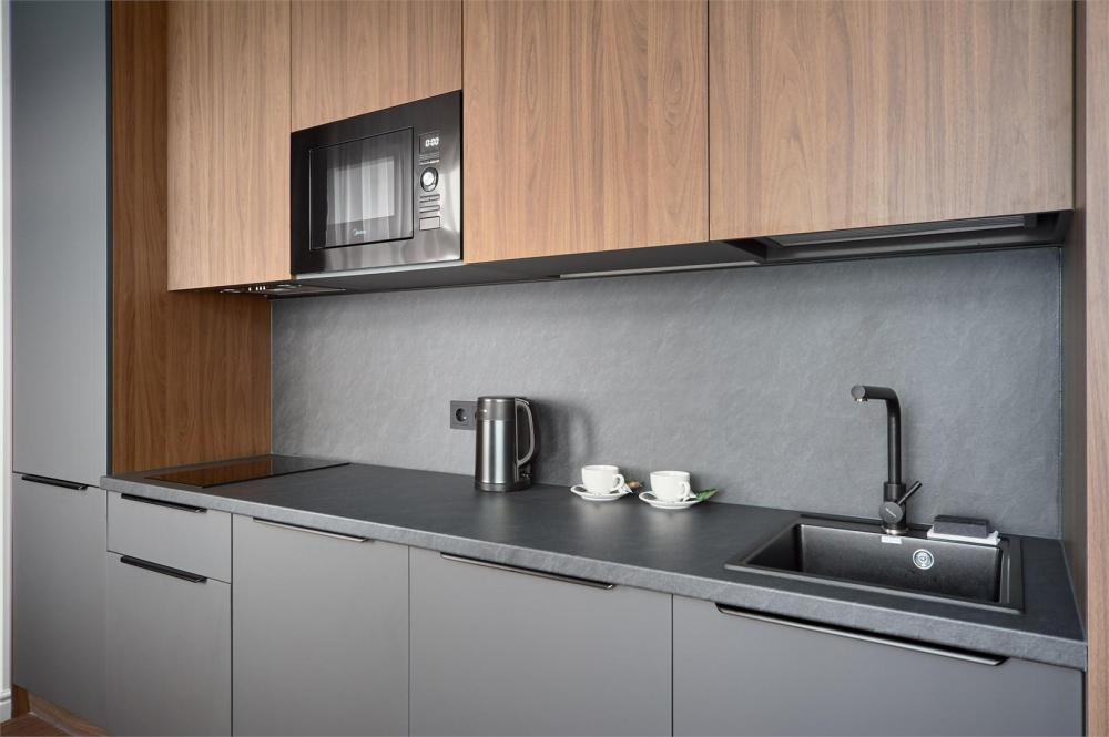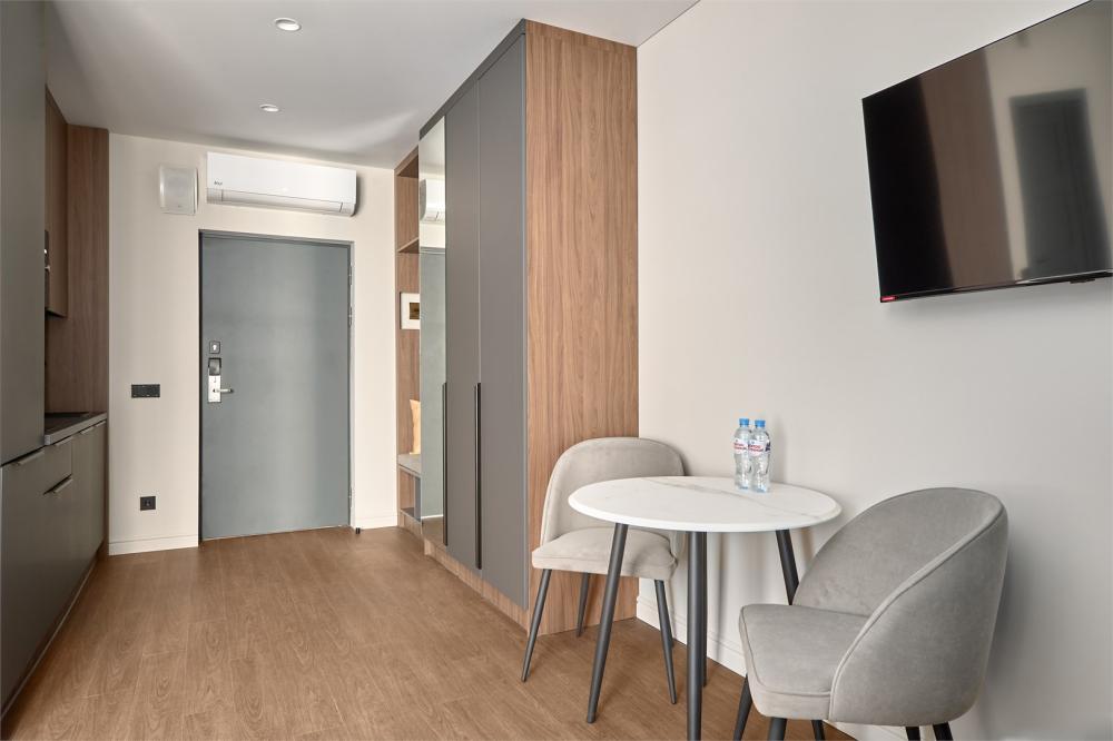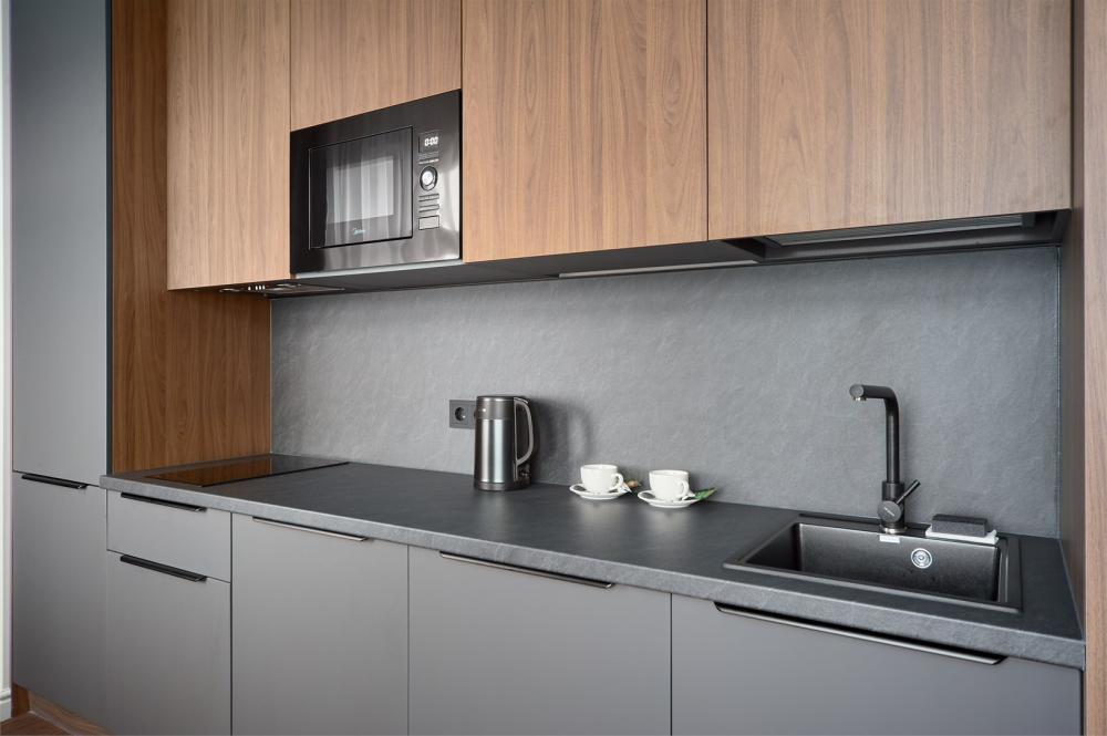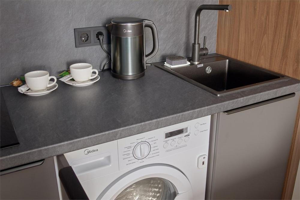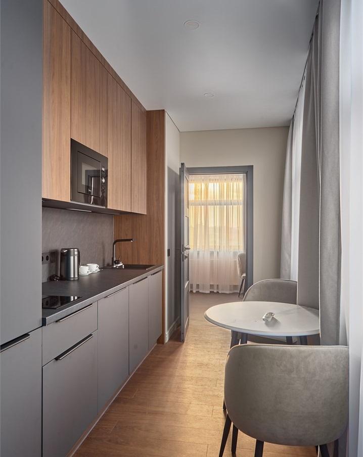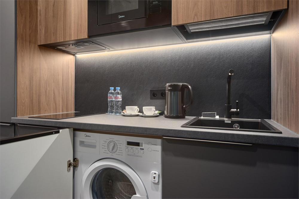 Стильные апартаменты люкс с современным ремонтом. В апартаментах полностью оборудованная кухня (техника последних моделей) и удобная ванная комната с душем. Для отдыха предусмотрена двуспальная кровать с удобным эргономичным матрасом. Идеально для комфортного проживания в уютной атмосфере. В номере: двуспальная кровать 180*200, телевизор, шкаф, бра, сейф, диван, рабочее место. В ванной комнате: раковина, душевая кабина, сушилка для полотенец, стиральная машина, фен, туалетные принадлежности, комплект полотенец. На кухне: кухонный гарнитур, микроволновая печь, холодильник, чайник, обеденный стол, стулья.
