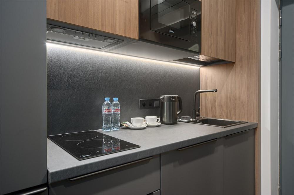 Комфортабельные двухместные апартаменты площадью от 24-30 кв.метров. Каждый номер оснащен двуспальной кроватью, обеденной зоной, кухонным уголком со всем необходимым. В каждом номере - чайник, микроволновая печь, холодильник, плита для приготовления пищи, посуда, столовые приборы. Ванная комната оснащена качественной сантехникой, всеми необходимыми туалетными принадлежностями, махровыми полотенцами и тапочками.