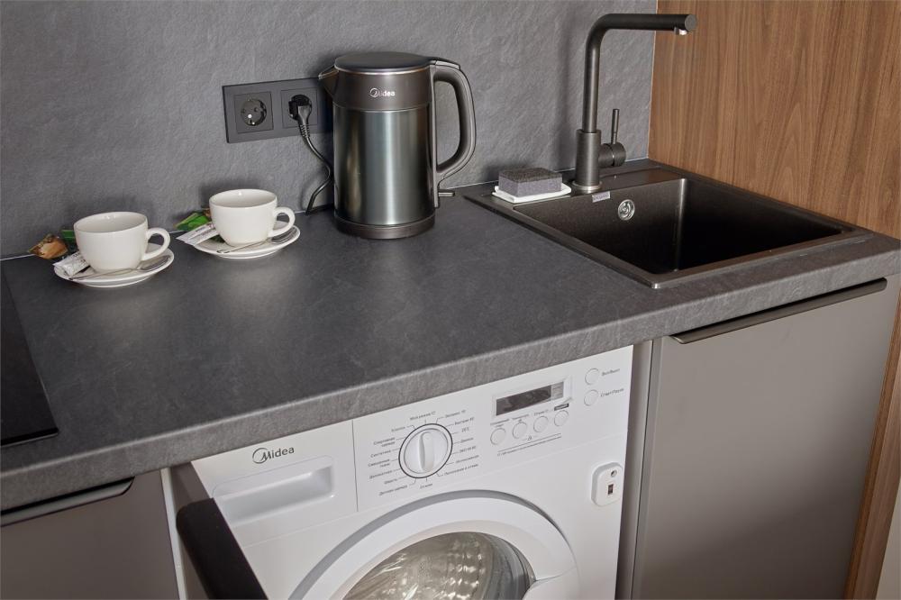 Комфортабельные двухместные апартаменты площадью от 21-28 кв.метров. Каждый номер оснащен двуспальной кроватью, обеденной зоной, кухонным уголком со всем необходимым. В каждом номере - чайник, микроволновая печь, холодильник, плита для приготовления пищи, посуда, столовые приборы. Ванная комната оснащена качественной сантехникой, всеми необходимыми туалетными принадлежностями, махровыми полотенцами и тапочками.