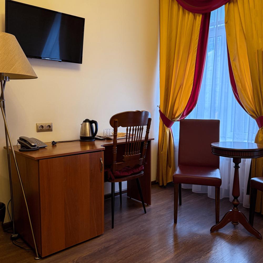 Комфортный номер с двуспальной кроватью или двумя односпальными кроватями, с видом на Невский проспект или во внутренний дворик. В номере кондиционер, телевизор с плоским экраном, кабельное телевидение, Wi-Fi, электронный сейф, телефон, центральное отопление, стол, шкаф, мини холодильник, электрочайник, собственная ванная комната с душевой кабиной, феном, банными и косметическими принадлежностями, тапочками.