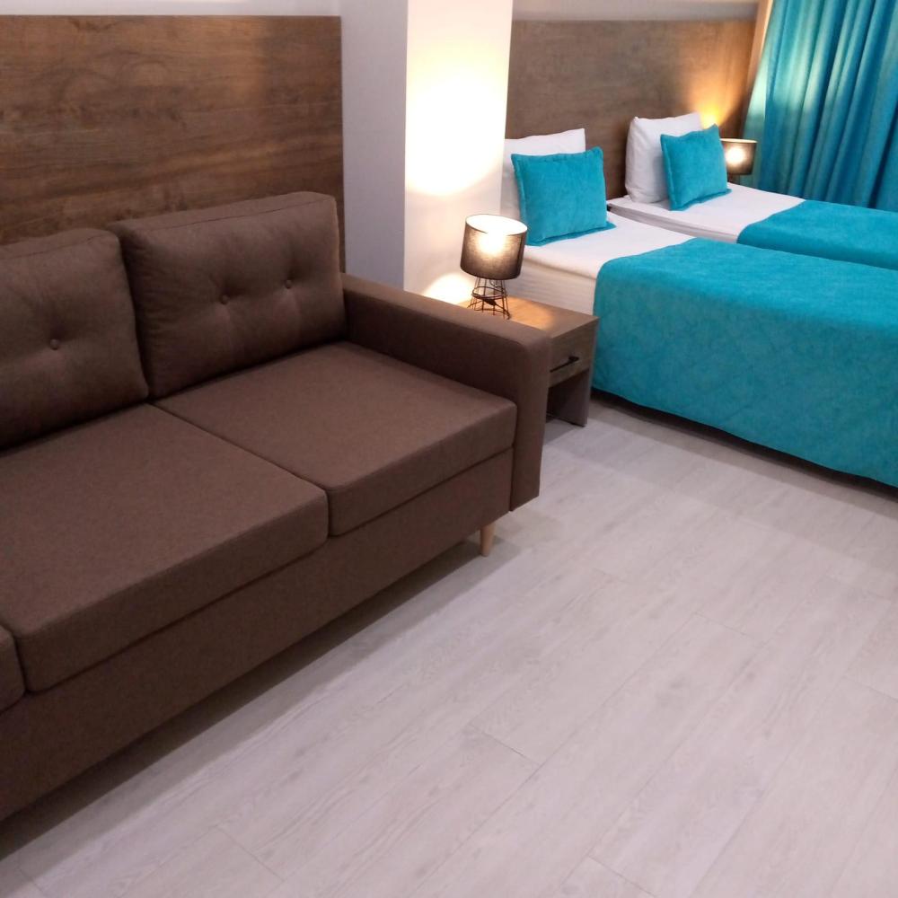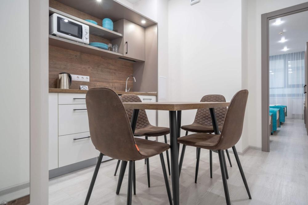 22 кв.м. Две односпальные кровати, детская кроватка(по запросу) Полотенце банное 2шт., полотенце для лица 2шт., белье Телевизор с плоским экраном, цифровое ТВ, телефон Холодильник, электрический чайник, микроволновка, плитка(по запросу) Посуда (Глубокие тарелки 3 шт, Большие тарелки 3шт, Маленькие тарелки 3шт, Пиалки - 3шт, Кружки - 3шт, Стаканы - 3шт; Вилки, Ложки, Ножи - 3 шт). Кувшин для фильтрации воды. Обеденный стол. Собственная ванная комната (душевая кабина, бесплатные туалетные принадлежности, туалет, фен) Отопление Окна выходят во двор.