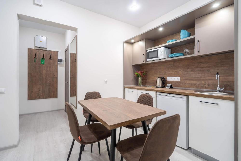 25 кв.м. Двуспальная кровать "king size" Детская кроватка(по запросу) Полотенце банное 2шт., полотенце для лица 2шт., белье Телевизор с плоским экраном, цифровое ТВ, телефон Холодильник, электрический чайник, микроволновка, плитка(по запросу) Посуда (Глубокие тарелки 3 шт, Большие тарелки 3шт, Маленькие тарелки 3шт, Пиалки - 3шт, Кружки - 3шт, Стаканы - 3шт; Вилки, Ложки, Ножи - 3 шт). Кувшин для фильтрации воды. Обеденный стол. Собственная ванная комната (душевая кабина, бесплатные туалетные принадлежности, туалет, фен, тапочки) Отопление Окна выходят во двор.