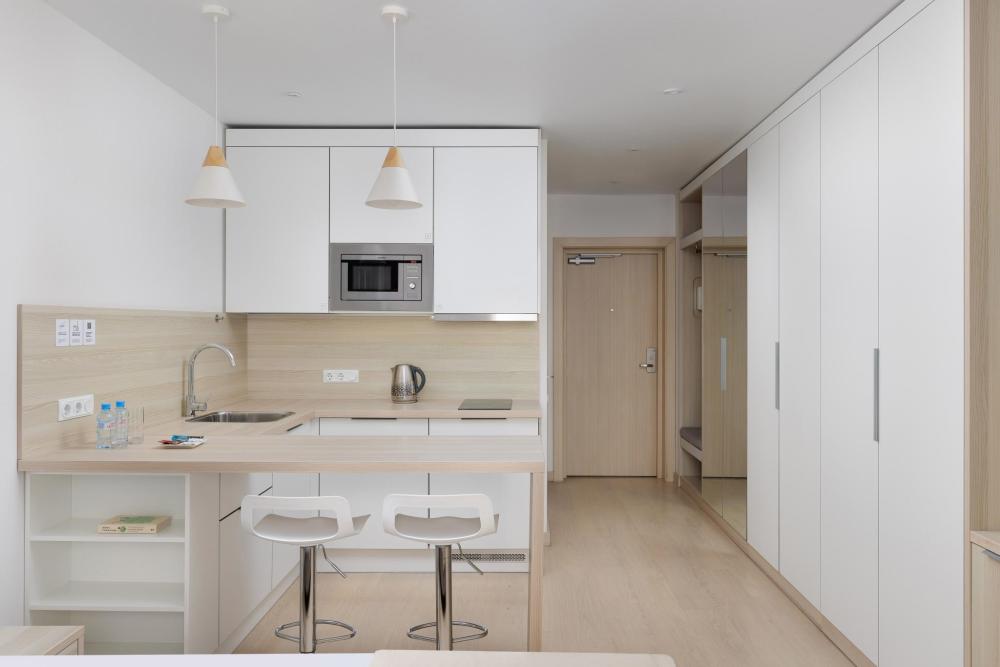 Апартаменты категории Studio ( 19-24 кв. метр) идеально подойдут для проживания 2 человек. Интерьеры выполнены в спокойных тонах, а лаконичный дизайн позволил вместить в малую площадь все необходимое для комфортного проживания. В комплектацию номера входят: диван-кровать, мини-кухня (микроволновая печь, мини-холодильник, плита для приготовления пищи), барная стойка, письменный стол, стулья, шкаф для одежды, телевизор с плоским экраном, ванная комната (душевая кабина). Для комфортного проживания в апартаментах имеется кабельное телевидение, утюг, фен, Wi-Fi, внутренний телефон, кухонная посуда, стиральная машина, столовые приборы, сушилка для белья, чайник, банные полотенца, гигиенические средства, тапочки. Обращаем ваше внимание на время работы магазинов и ресторанов во время новогодних праздников: 31 декабря Фудхолл работает до 18:00 (далее закрывается на новогоднее мероприятие), кофейня Ar и PIMS будут работать до 18:00. Первого января Фудхолл открывается с 14:00 (завтраки в Джорджии реализуются с 10:00 до 15:00), кофейня Ar начнет работу с 12:00, чайная PIMS с 14:00. Магазин All Ready продолжит работу круглосуточно. Со второго января и далее все заведения работают в обычном режиме.